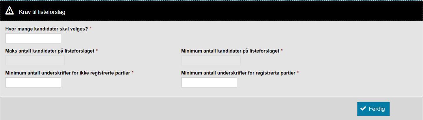 Velg "Krav til listeforslag" i grunnlagsdata. Minimum og maksimum antall kandidater som skal velges vil variere fra kommune/fylke til kommune/fylke.