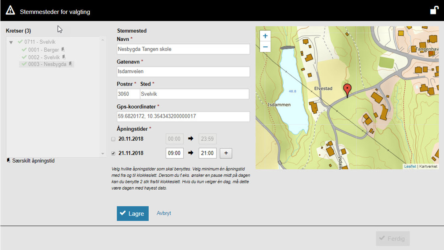 Åpningstidene for hvert enkelt stemmested er forhåndsutfylt. Disse kan imidlertid overskrives. Det er mulig å legge inn to tidspunkt per valgdag. For eksempel kl. 09.00 - 13.00 og kl. 15.00 - 21.00, dersom det er ønskelig.