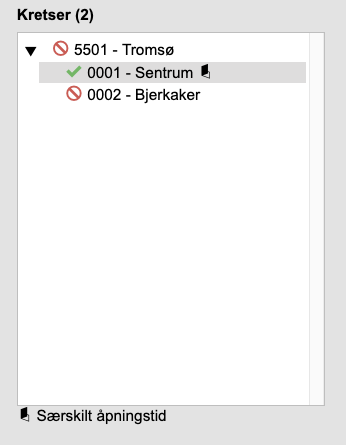 Dersom det ikke er registrert informasjon om stemmestedet for kretsen i EVA vil det være et rødt symbol foran navnet på stemmekretsen. Det er i dette vinduet du skal legge inn åpningstider for valgdagen(e). For kommuner som velger å bruke papirmanntall på valgdagen er det også her du må velge om du ønsker å bruke roder.