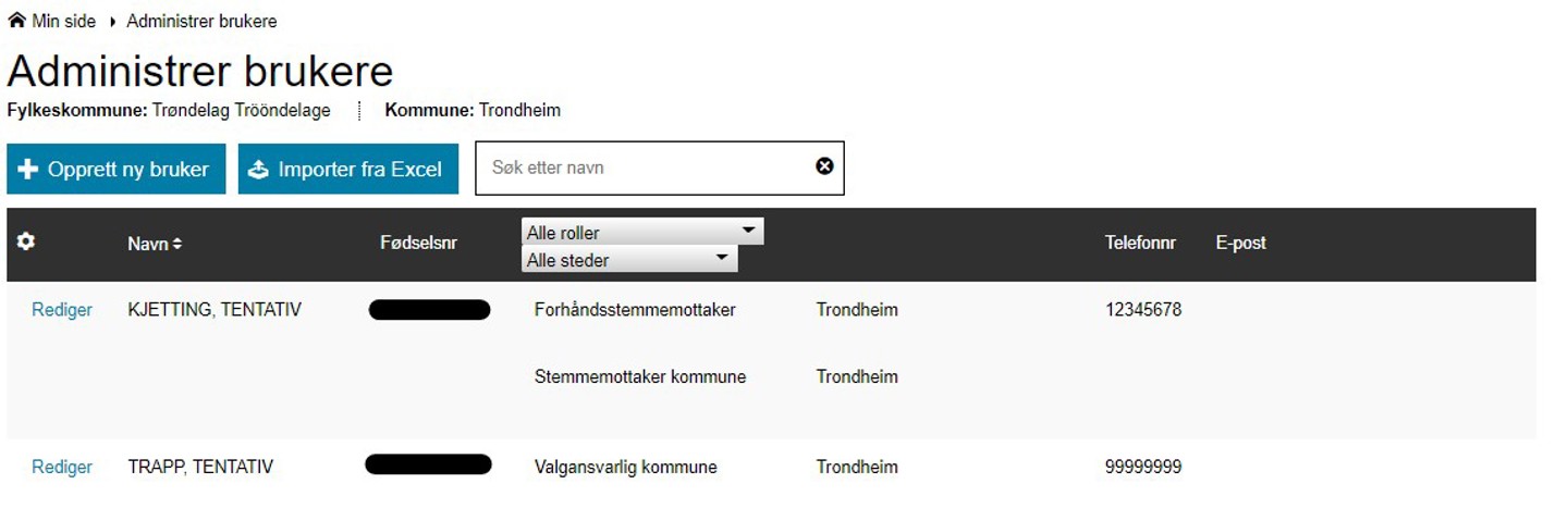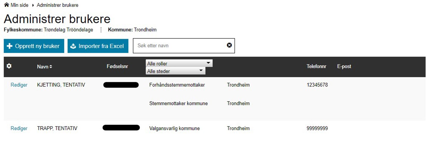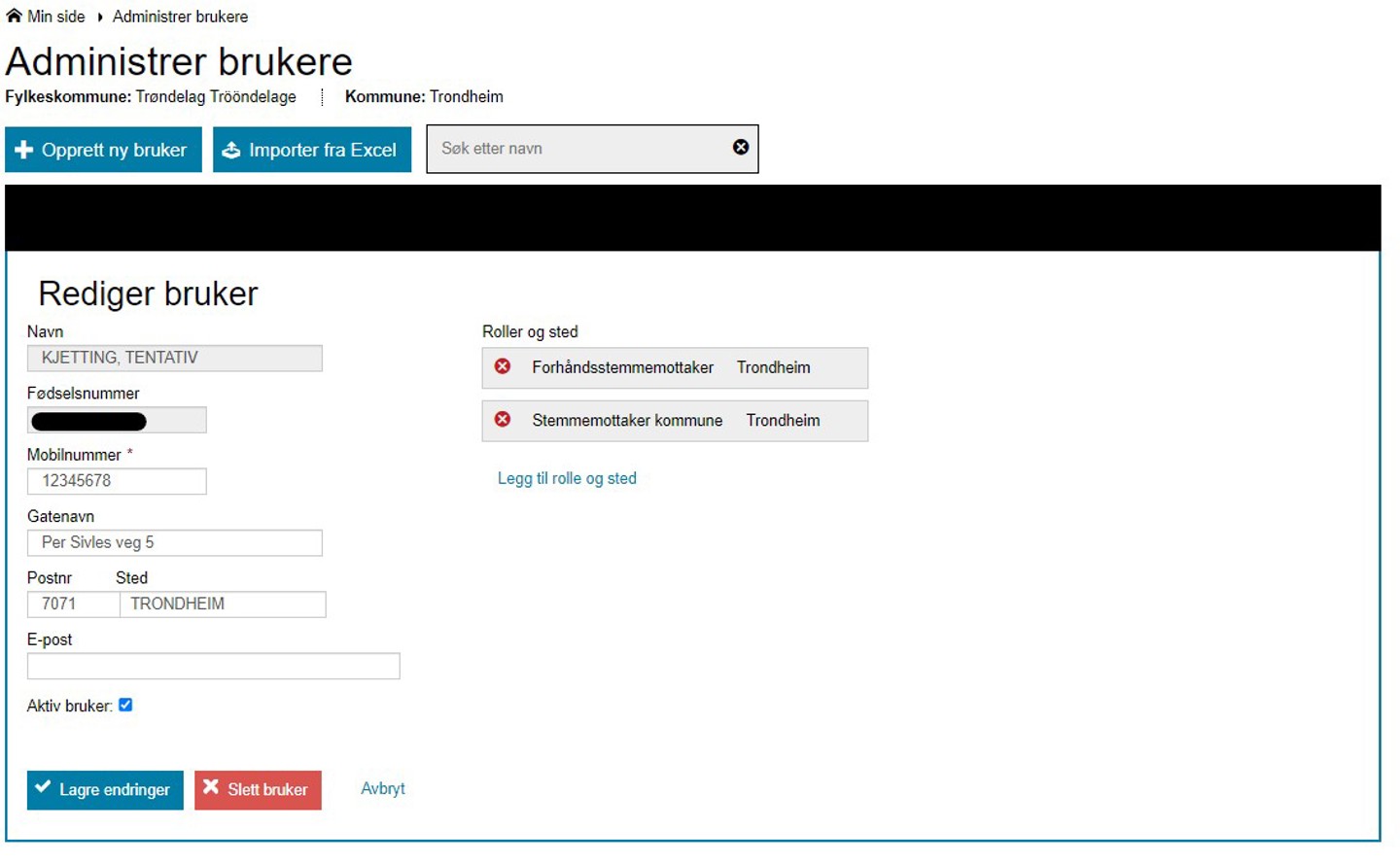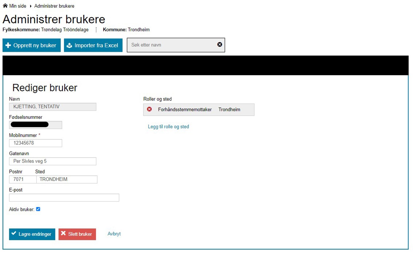 Når du skal opprette en ny bruker kan du søke på fødselsnummeret eller navnet til personen. Når du har søkt opp personen trykker du på navnet, så kommer du inn på siden "Rediger bruker". Dersom personen finnes i manntallet vil all kontaktinformasjon ligge der.