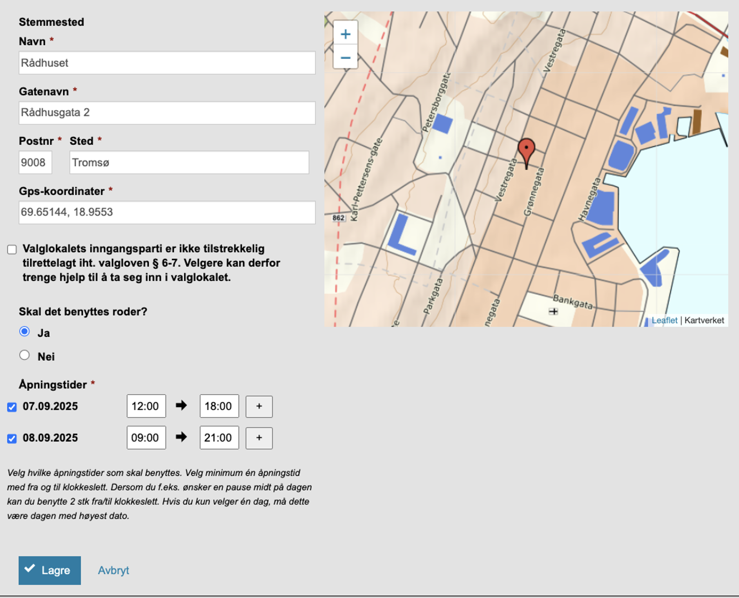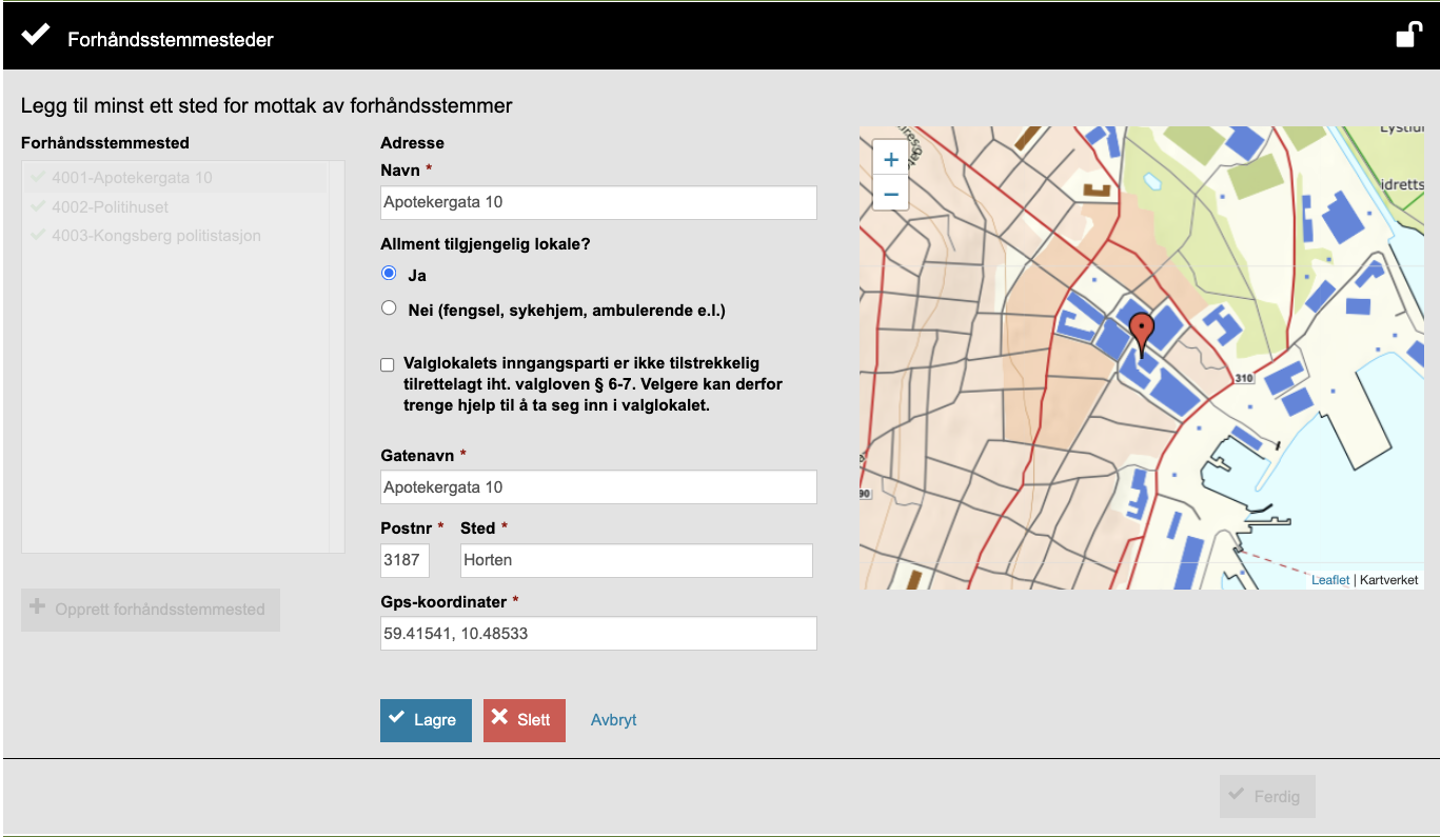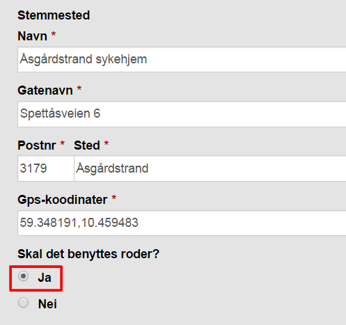 Markerer du at stemmestedet skal være allment tilgjengelig må du legge inn GPS-koordinater og forhåndsstemmestedet vil være synlig for velgere på nettsiden valglokaler.no. Velger du nei, vil forhåndsstemmestedet ikke være synlig på valglokaler.no og det er ikke behov for å legge inn GPS-koordinater.