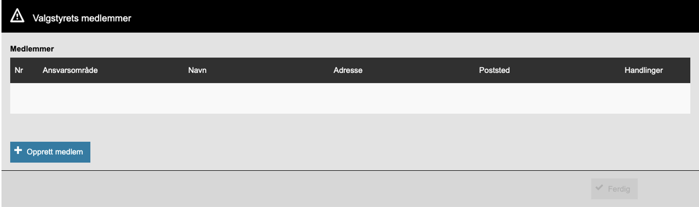 Delene "Valgstyrets medlemmer" og "Ansvarlig for valglokale" har svært lik funksjonalitet og gjennomgås derfor sammen her. Feltene blir ikke låst 31. mai, slik at det er mulig å legge inn endringer frem til valgdagen.