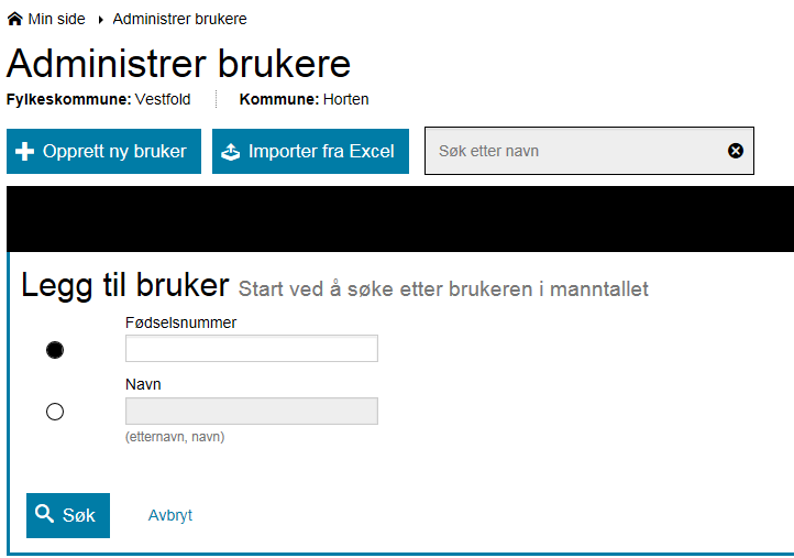 For kommuner og fylkeskommuner med mange brukere kan det være nyttig å søke opp brukere dersom du har behov for å redigere eller slette brukere. Dette gjør du på førstesiden under "Administrer brukere".