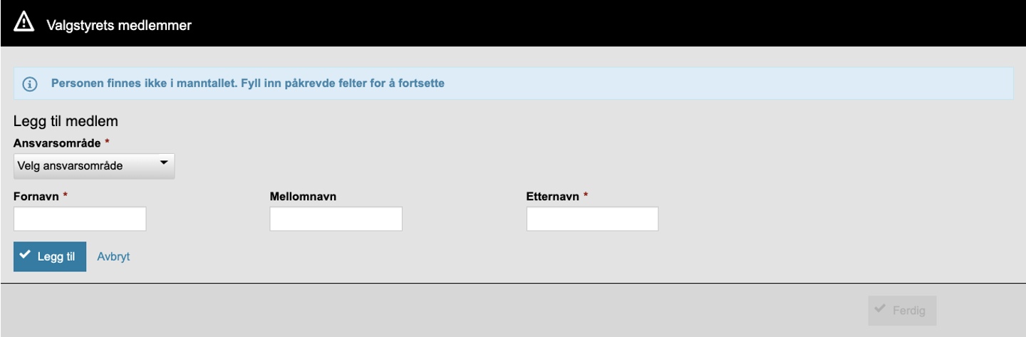 Skriv inn fødselsnummer eller fødselsdato og navn, og trykk "Søk i manntall". Dersom personen ikke finnes i manntallet, kan du fylle ut alle felt manuelt.