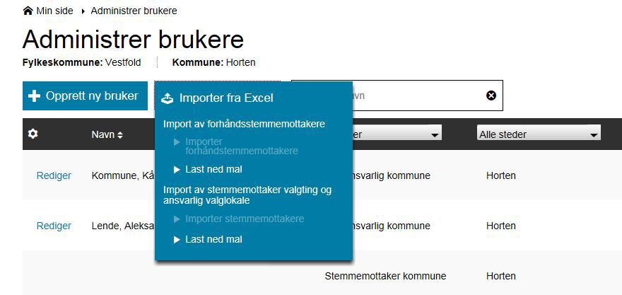 Dersom du har flere brukere du skal tildele roller, kan du også gjøre dette ved å importere en Excel-fil. Malen for dette finner du ved å gå inn på menyvalget "Administrer brukere" og trykke på "Importer fra Excel", og velge "Last ned mal".