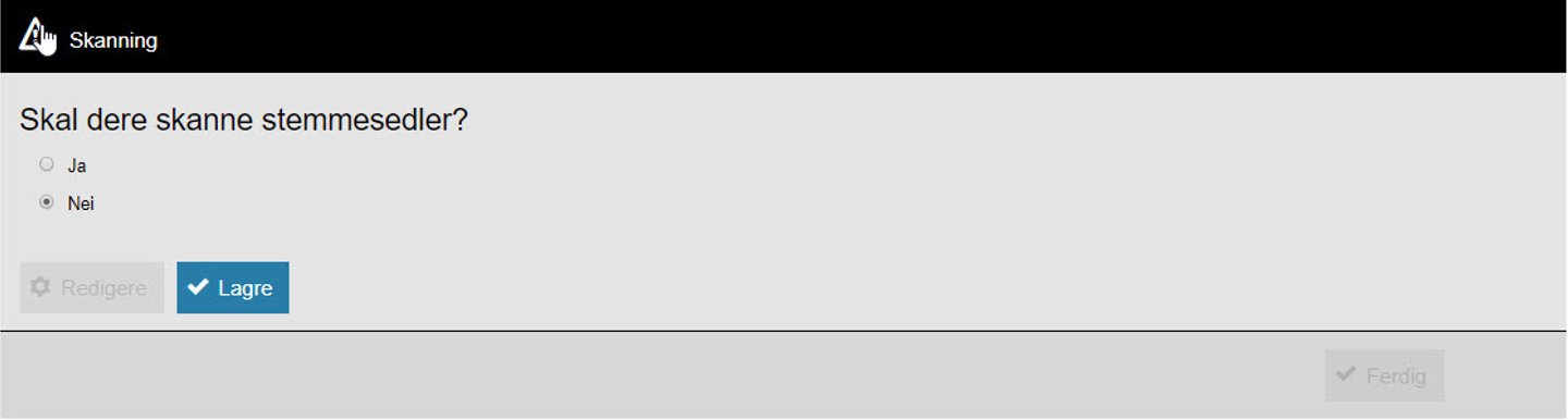 Det må oppgis hvorvidt kommunen vil benytte seg av en skanningleverandør. Valgdirektoratet vil ved hvert valg sørge for at listen med skanningleverandører er oppdatert og i henhold til de leverandørene du har mulighet til å gjøre avrop på.