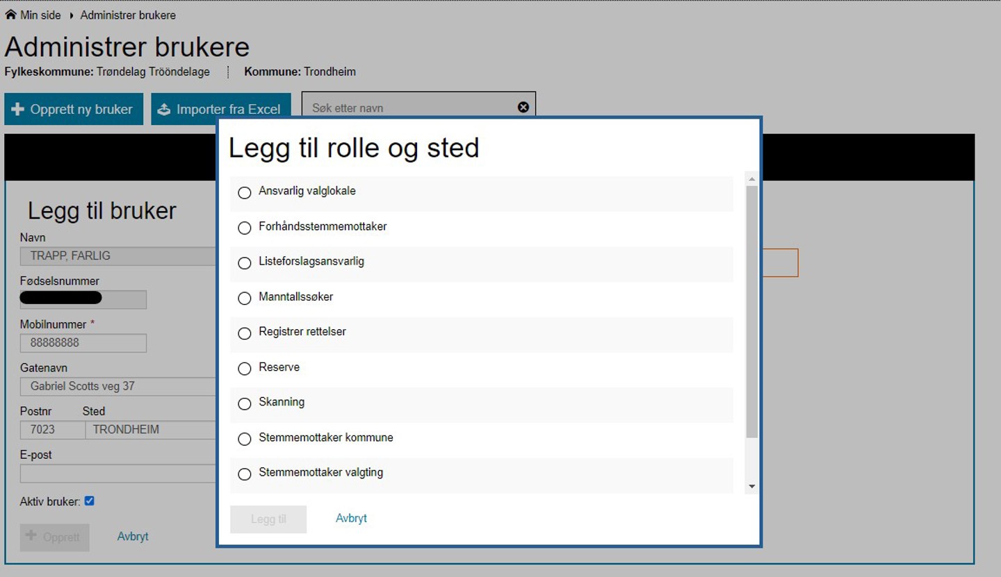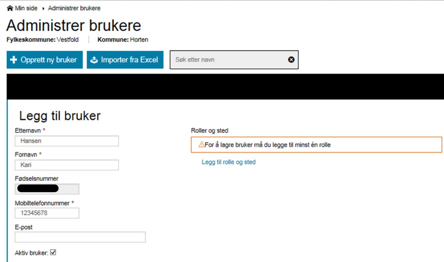 Legg inn fødselsnummer i søkefeltet og klikk på søk. Du vil da få opp vindu for å legge til bruker. Legg inn personopplysninger og mobiltelefonnummer før du tildeler vedkommende en rolle.