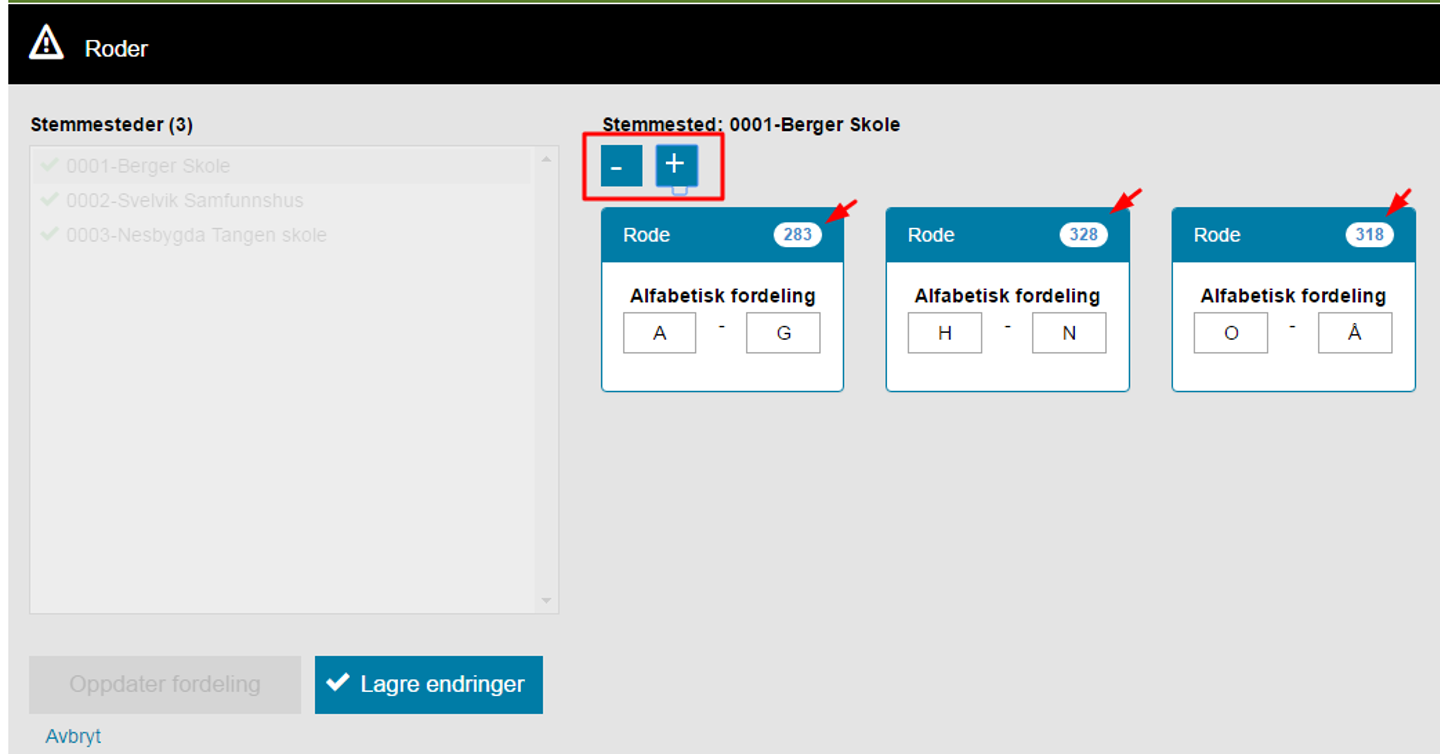 + og - knappene brukes til å velge antall roder. Tallet i hver boks viser antall manntallsførte.