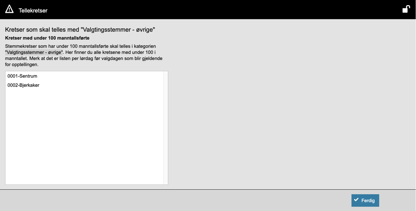 Stemmekretser med under 100 stemmeberettigede skal telles i kategorien "Valgtingsstemmer - øvrige". Hvis kommunen har stemmekretser i denne størrelsen, så vil disse vises under denne fanen.