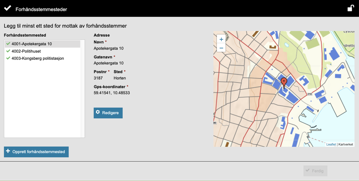 Slik endrer du informasjon på et forhåndstemmested før fristen. Du markerer det forhåndsstemmestedet du ønsker å endre og klikker på knappen "Redigere". Obligatoriske felt er merket med røde stjerner.