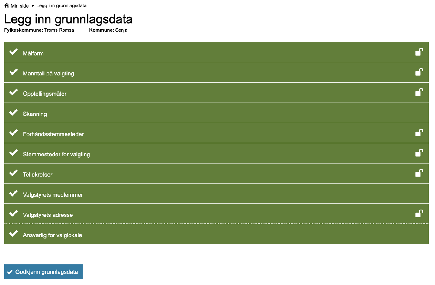 Nå må dette oppsettet godkjennes av dere. Dette er for å gi beskjed til Valgdirektoratet om at din kommune er ferdig med å legge inn grunnlagsdata.