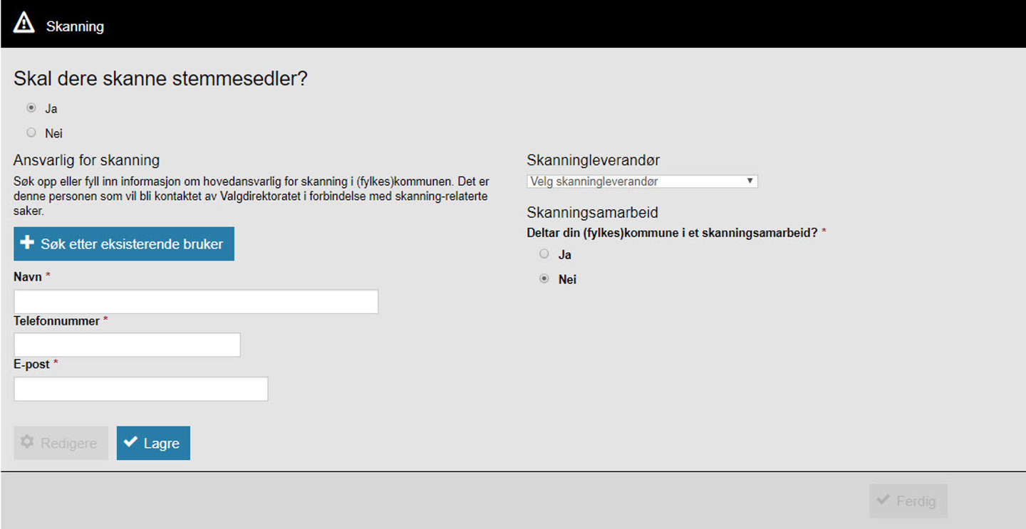 Dersom kommunen velger "Ja" til å skanne stemmesedler, må det legges inn kontaktinformasjon til en skanning-ansvarlig i kommunen. Denne personen vil være kommunens kontaktperson i forbindelse med skanningrelatert informasjon.