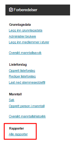 Menyvalg "Alle rapporter" på Min side. Det er bare fylkeskommunen som har tilgang til listeforslag under et stortingsvalg. Ved et kommunestyrevalg har også kommunene tilgang.