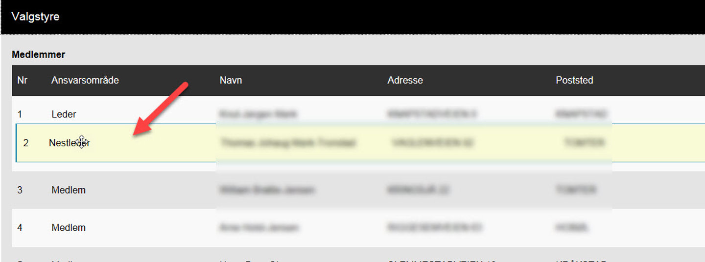 Du kan endre rekkefølgen på medlemmene ved å klikke på ett medlem, og dra vedkommende oppover eller nedover i listen og så slippe. Det er derimot ikke mulig å bytte roller på medlemmer. Har en person fått feil rolle må den slettes, og medlemmet må opprettes på nytt.