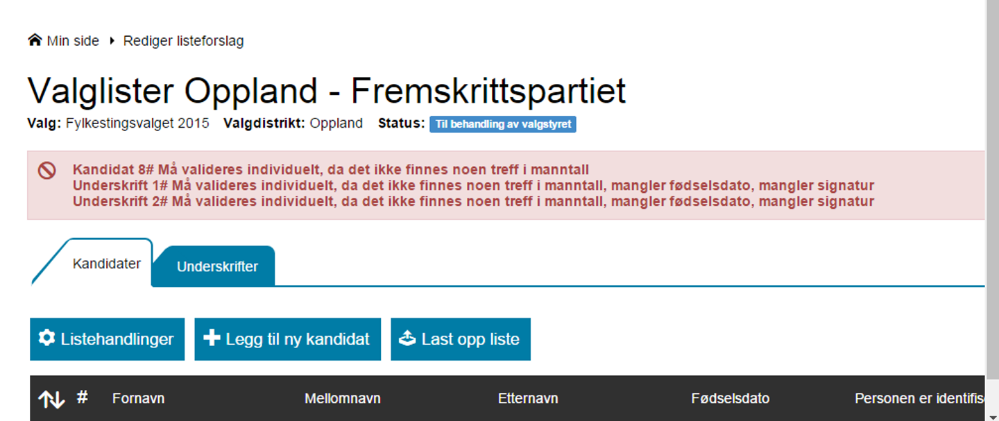 Når en validering blir utført, eller en status blir satt, gjelder dette for hele listeforslaget til partiet. Dvs. at både kandidatlisten og underskriftslisten kontrolleres og blir behandlet sammen.
