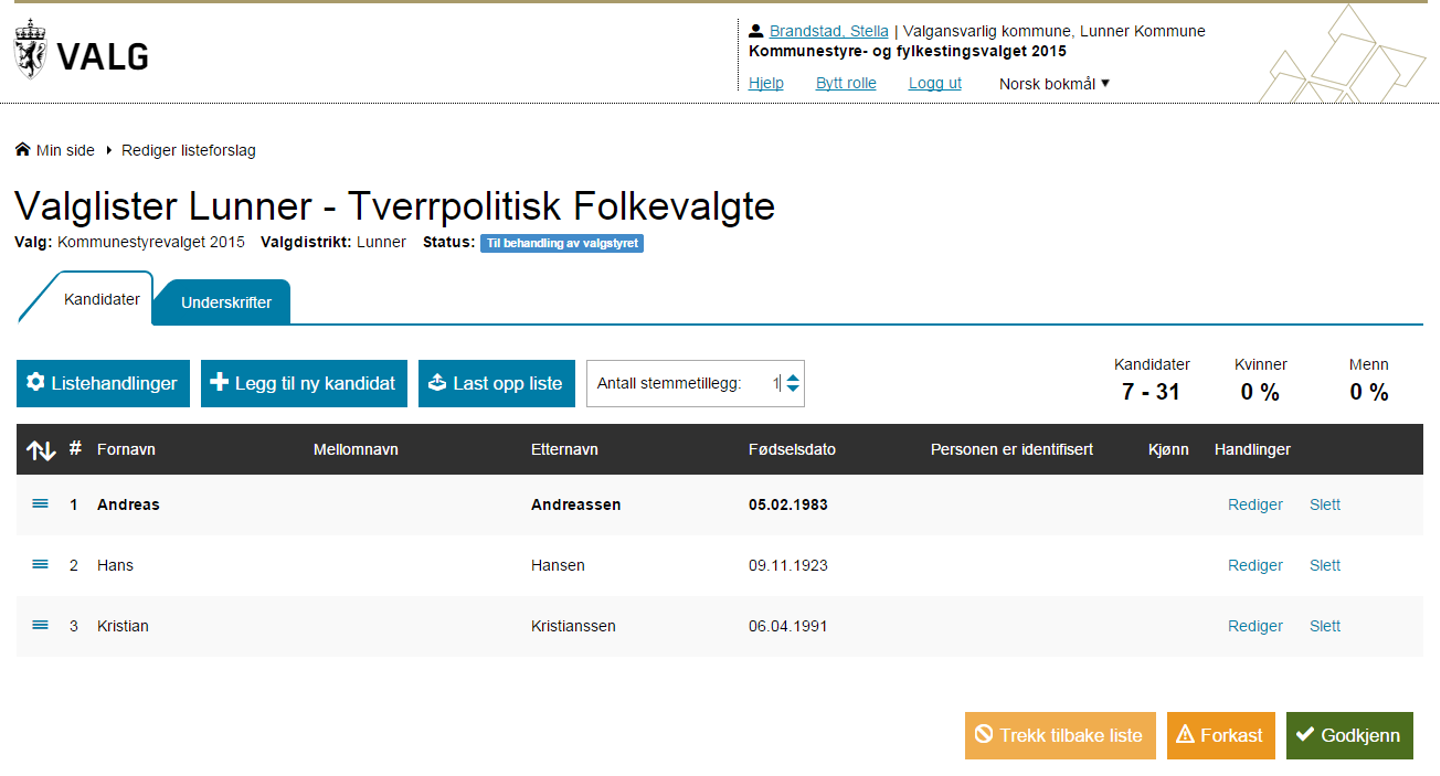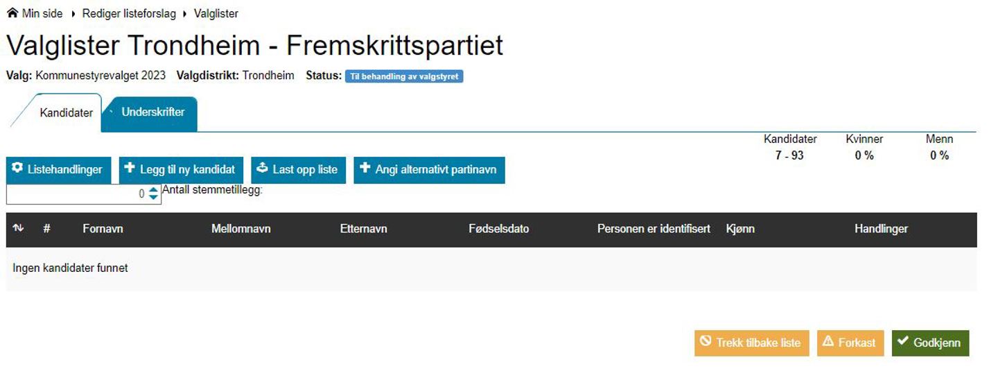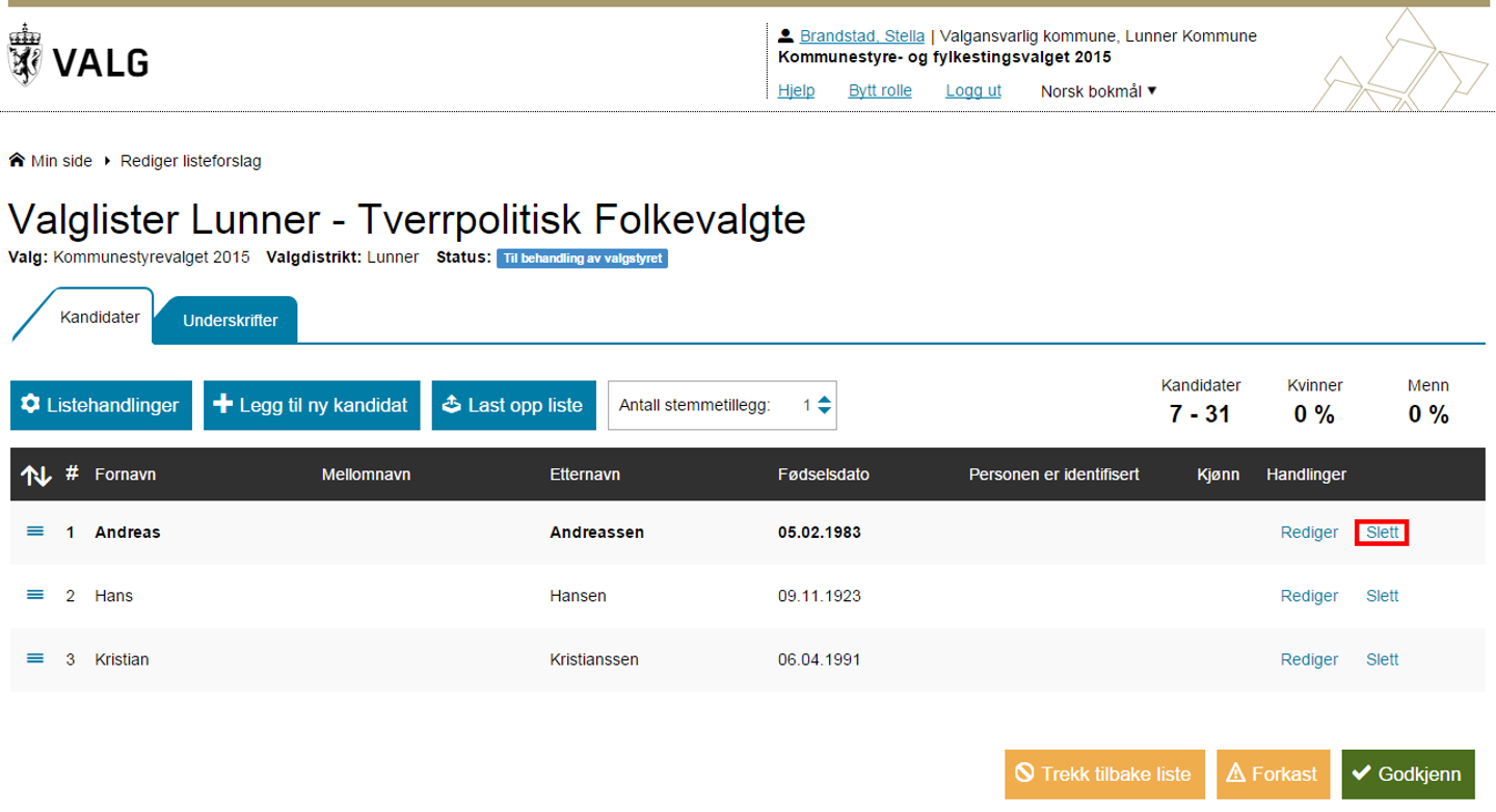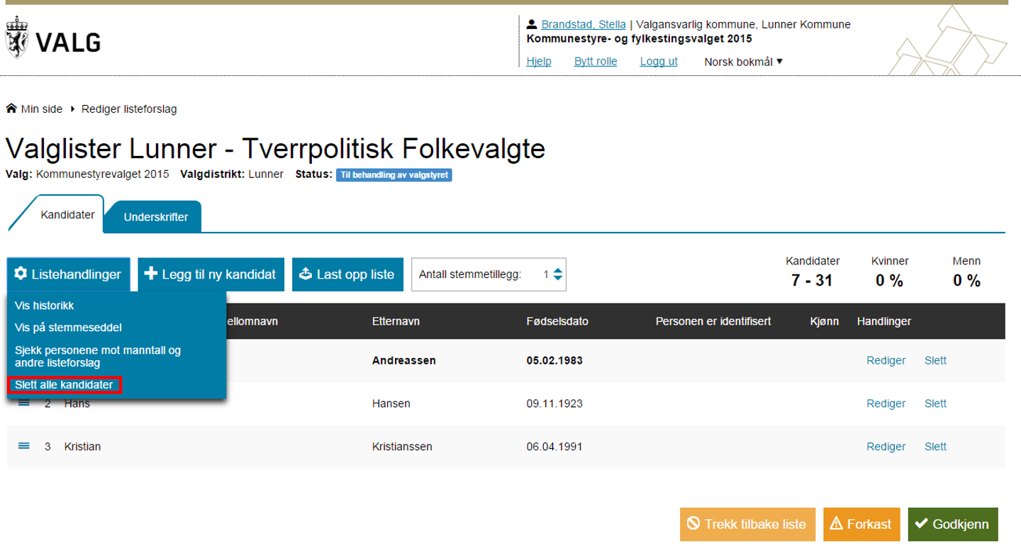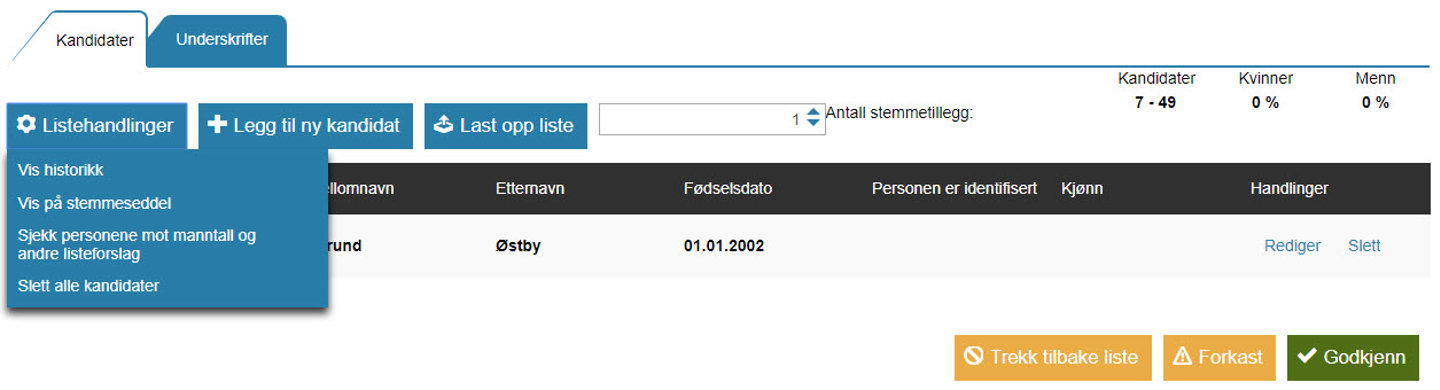 Det er også mulig å slette en eller alle kandidatene på et listeforslag.