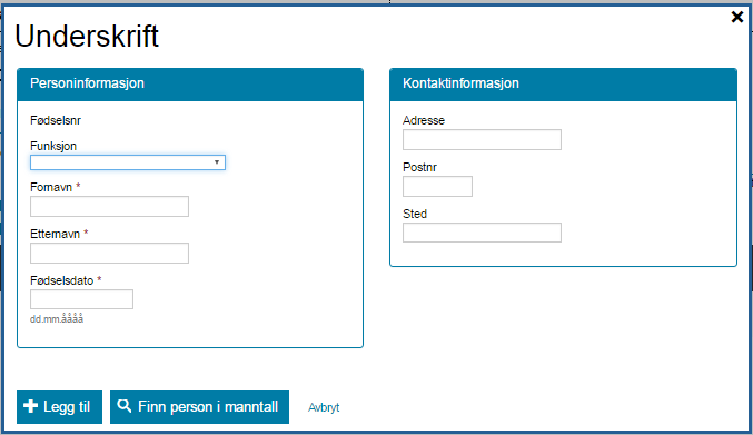 Når man legger til ny underskrift manuelt må man registrere fornavn, etternavn og fødselsdato. Disse feltene blir sjekket mot manntallet når man validerer listen, og må derfor stemme med manntallet for at fødselsnummeret automatisk skal legges til ved validering. Det er også mulig å søke opp underskrifter direkte i manntallet på samme måte som man søker opp kandidater og tillitsvalgte.