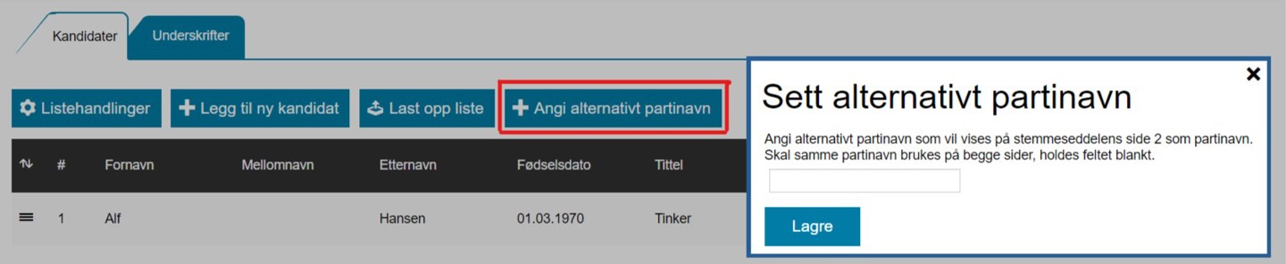 Det er mulig å legge inn alternativt partinavn. Alternativt partinavn vil vises som partinavn på side 2 av stemmeseddelen. Hvis samme partinavn skal brukes på begge sider, holdes feltet blankt.