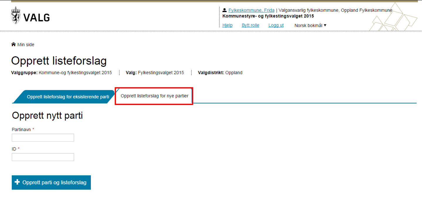 Hvis et nytt parti skal opprettes må ikke partiets navn kunne forveksles med et registrert politisk parti eller med andre listeforslag i valgdistriktet. Man oppretter nye partier ved å klikke på fanen "Opprett listeforslag for nye partier".