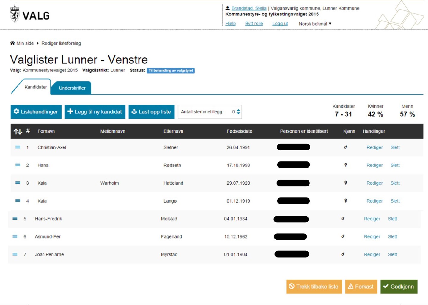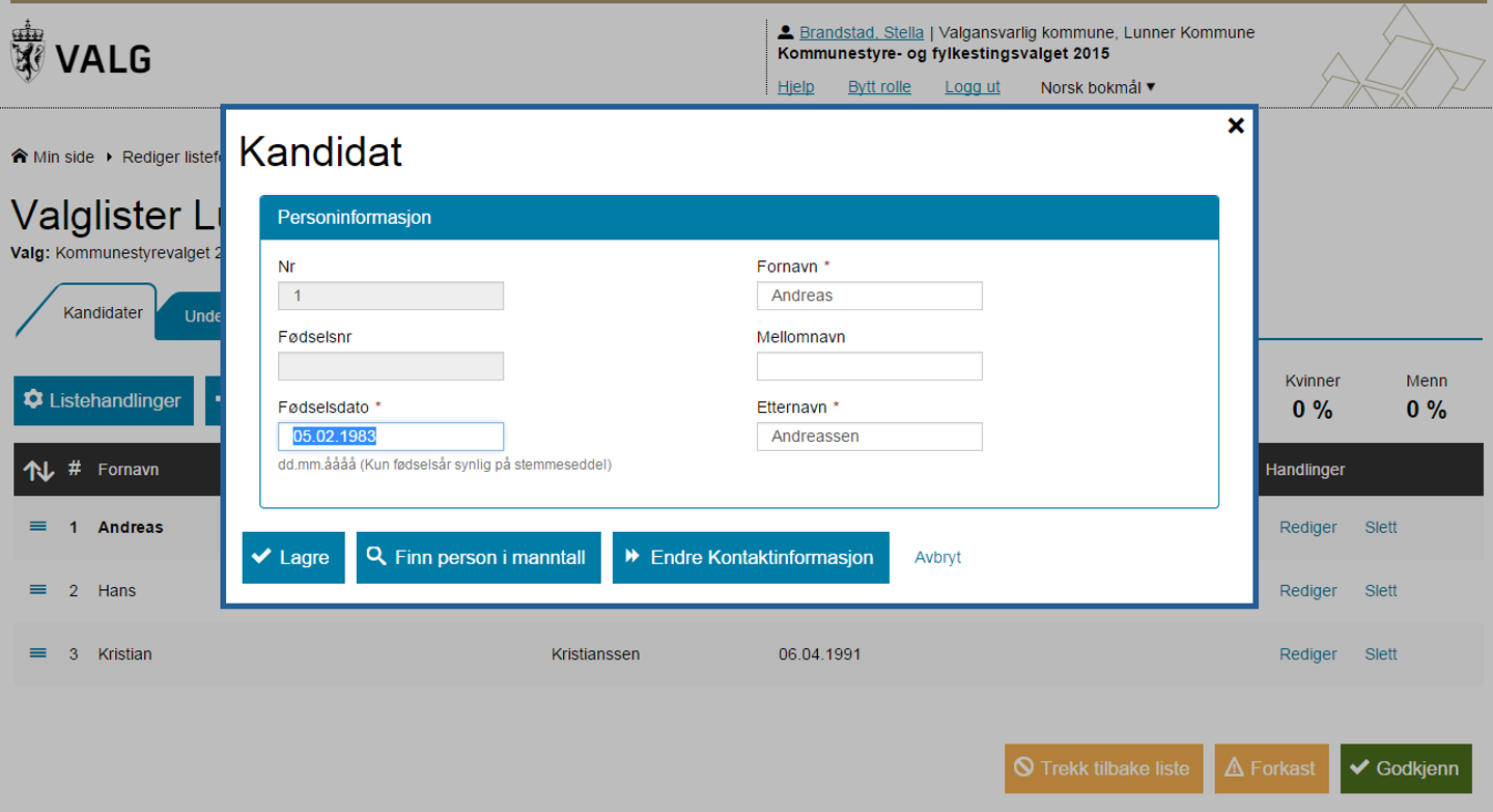 Når man vil redigere en kandidat må man klikke på "Rediger" ved siden av navnet til kandidaten.
