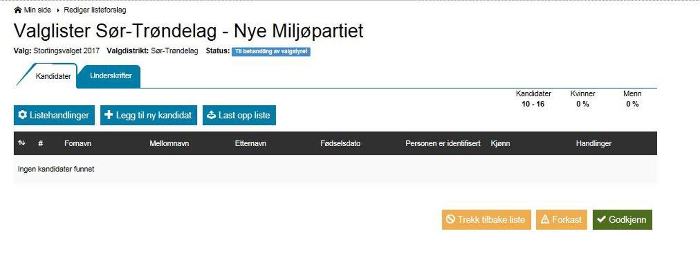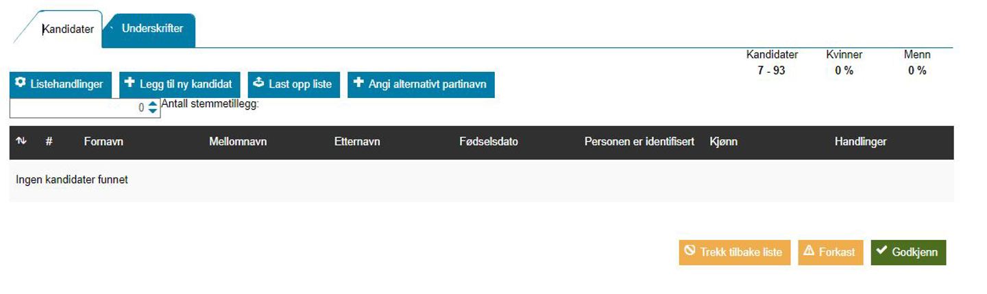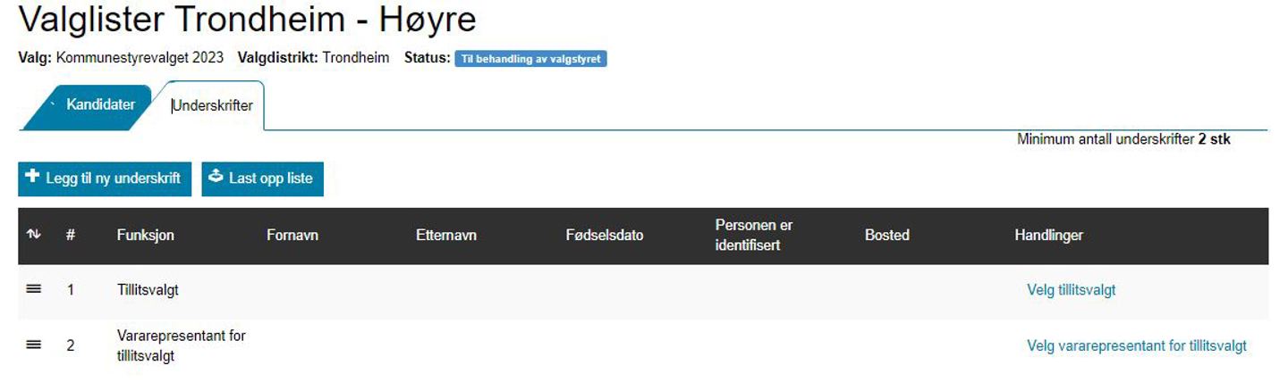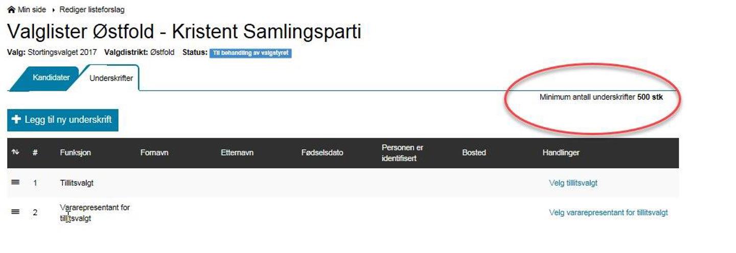 Ved et stortingsvalg må partiet ha minimum 500 godkjente underskrifter i det fylket partiet stiller liste. Så lenge status på listeforslaget er "Til behandling av valgstyret", kan underskrifter redigeres og slettes.