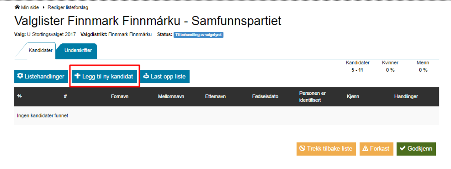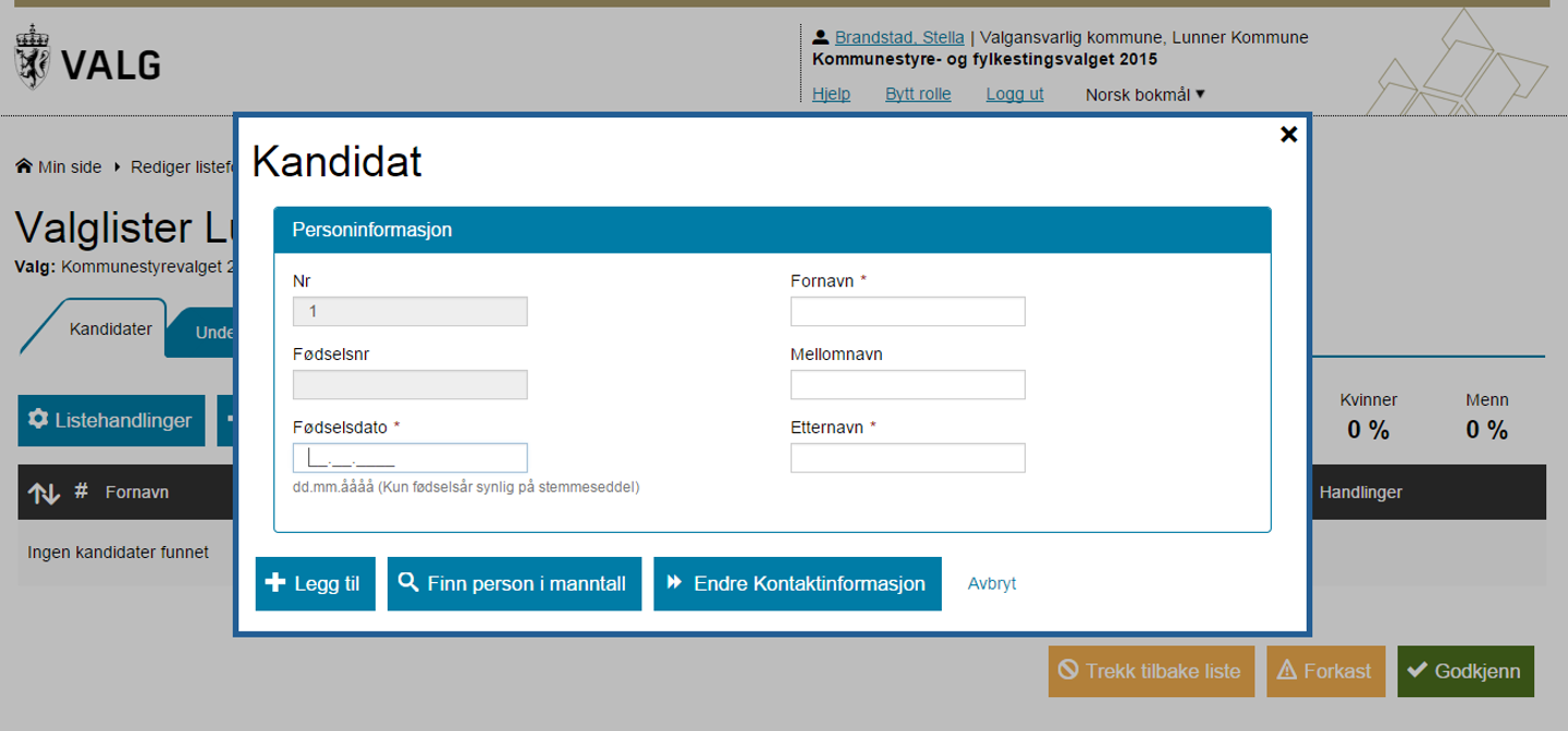 Klikk på "Legg til ny kandidat". Når man legger til ny kandidat manuelt, må man legge inn fornavn, etternavn og fødselsdato og evt tittel og eller bosted. Disse feltene blir sjekket mot manntallet når man validerer listen, og må derfor stemme overens med manntallet for at fødselsnummer automatisk skal legges til ved validering. Se brukerveiledningen for godkjenn listeforslag.