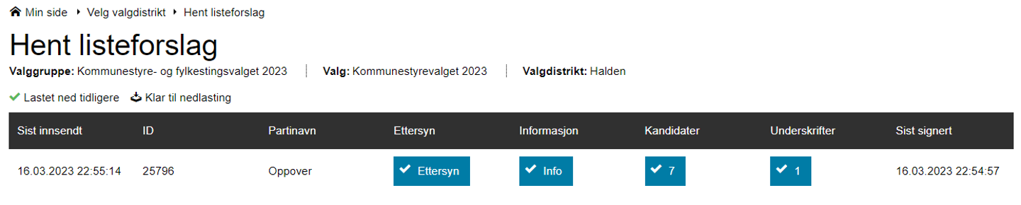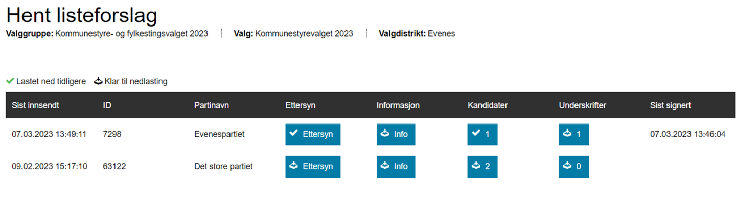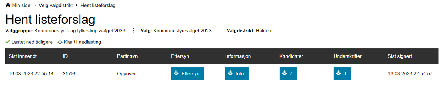 Neste bilde viser et listeforslag som er hentet fra den elektroniske listeforslagsløsningen. For listeforslaget kan man laste ned filer for ettersyn, informasjon, kandidatliste og underskrifter hver for seg. Dette gjøres ved å trykke på de blå knappene. Det genereres altså fire ulike filer i excel-format som lastes ned hvis man trykker på de fire blå knappene.