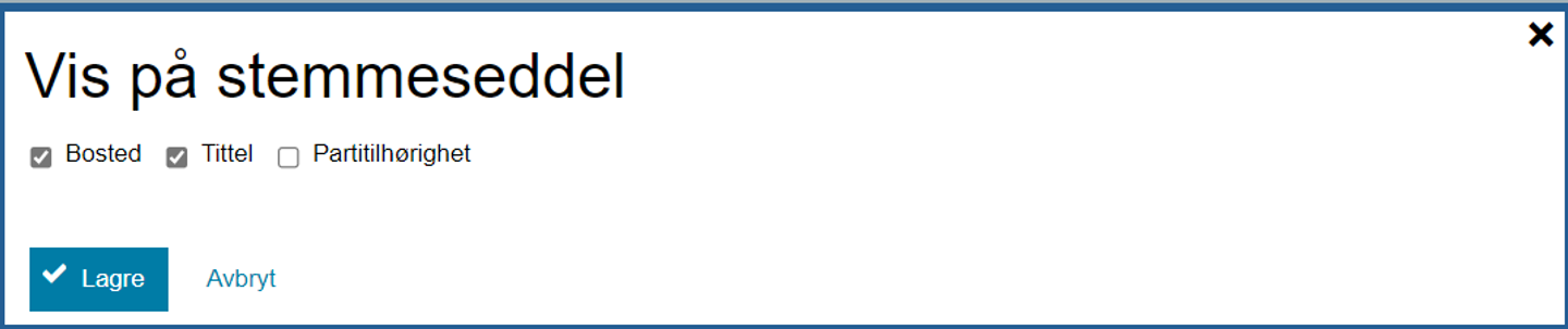Partier og politiske grupper kan selv velge om de ønsker at tittel og/eller bosted til kandidatene skal vises på stemmeseddelen. Dersom dette er ønskelig må det legges til manuelt på hver enkelt kandidat. Først må man tilgjengeliggjøre muligheten til å legge inn tittel og/eller bosted. Dette gjøres under "Listehandlinger" og "Vis på stemmeseddel".