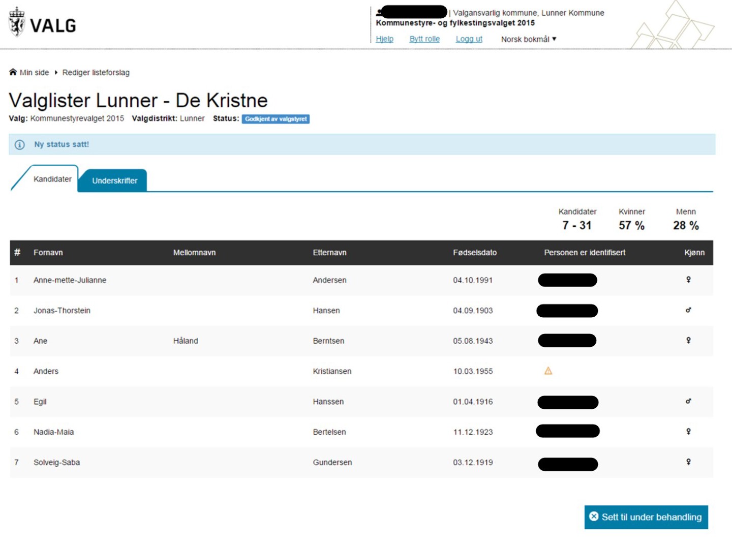 Etter godkjennelse av listeforslaget er det mulig å starte behandling av listeforslaget på nytt, og endre status fra "Godkjent i valgstyret" til "Til behandling av valgstyret".