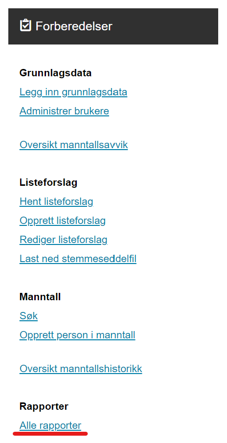 Menyvalg "Alle rapporter" på Min side. Det er bare fylkeskommunen som har tilgang til listeforslag under et stortingsvalg.