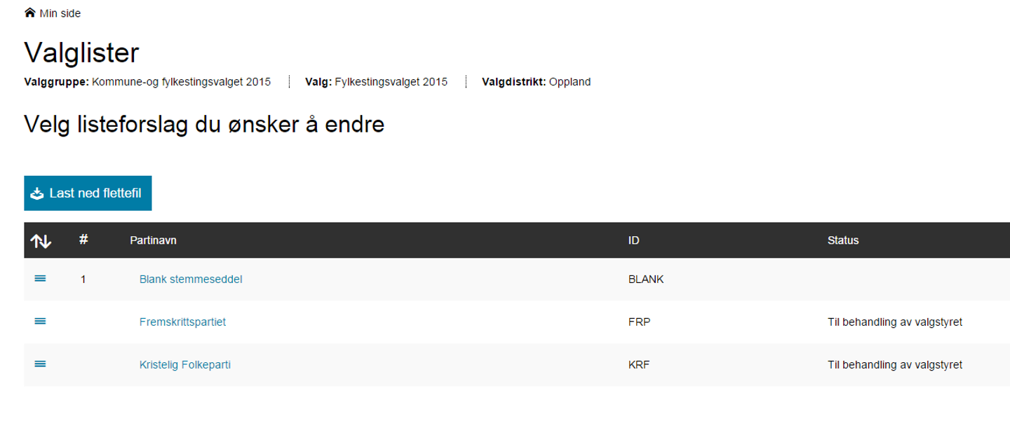 I oversikten over alle listeforslag finnes det en link til "Last ned flettefil". Dette er en Excel-fil som kommunene benytter til å flette inn informasjon om kandidater i brev mm.
