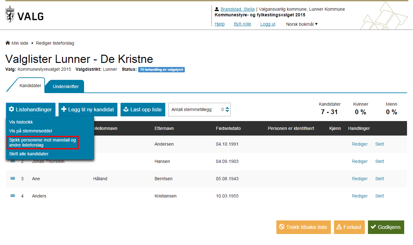 Det er også under "Listehandlinger" man kontrollerer kandidater på listeforslag mot manntall og andre listeforslag. EVA gir tilbakemelding til bruker dersom man finner at kandidater på listeforslag ikke finnes i manntallet for valgdistriktet, eller også er oppført på andre listeforslag.