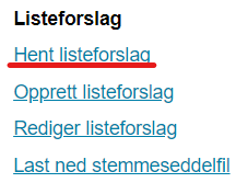 Listeforslag som er opprettet i den elektroniske listeforslagsløsningen kan hentes inn i EVA Admin. Menyvalget for dette heter "Hent listeforslag".