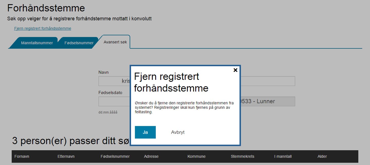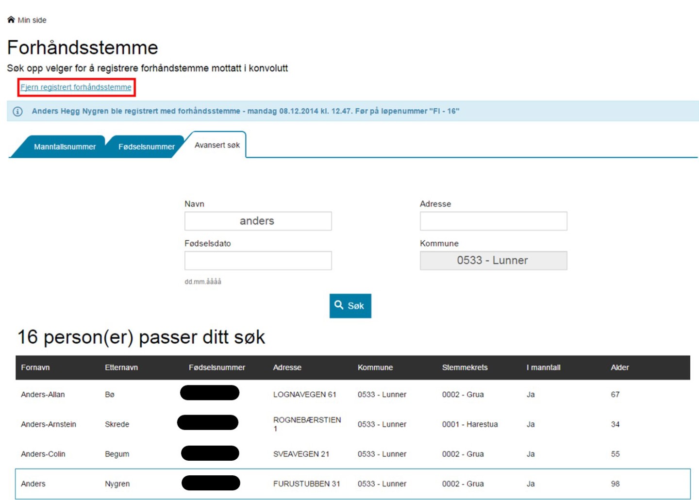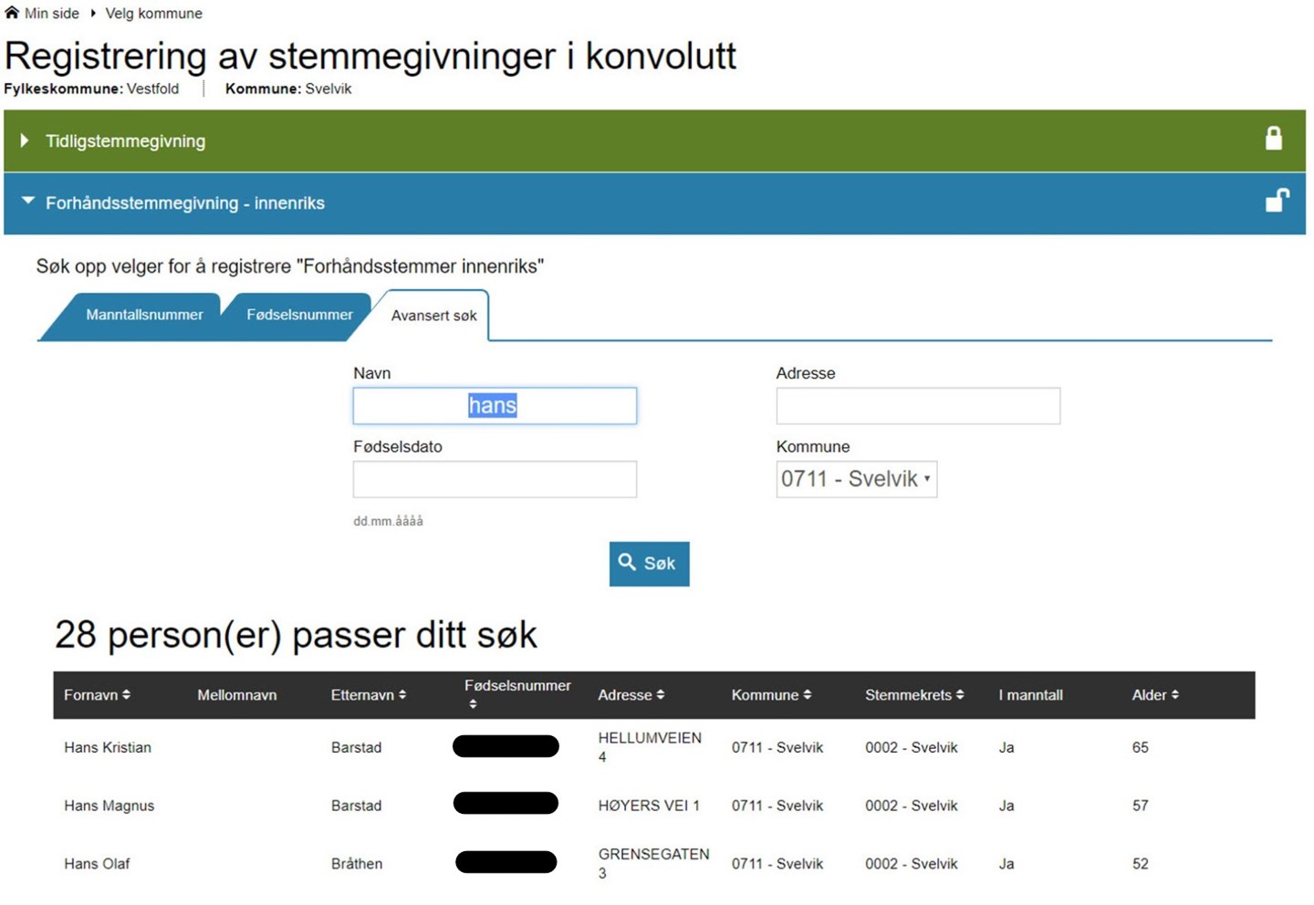 Registrer forhåndsstemme - Søkeresultat ved bruk av avansert søk - flere treff på søket