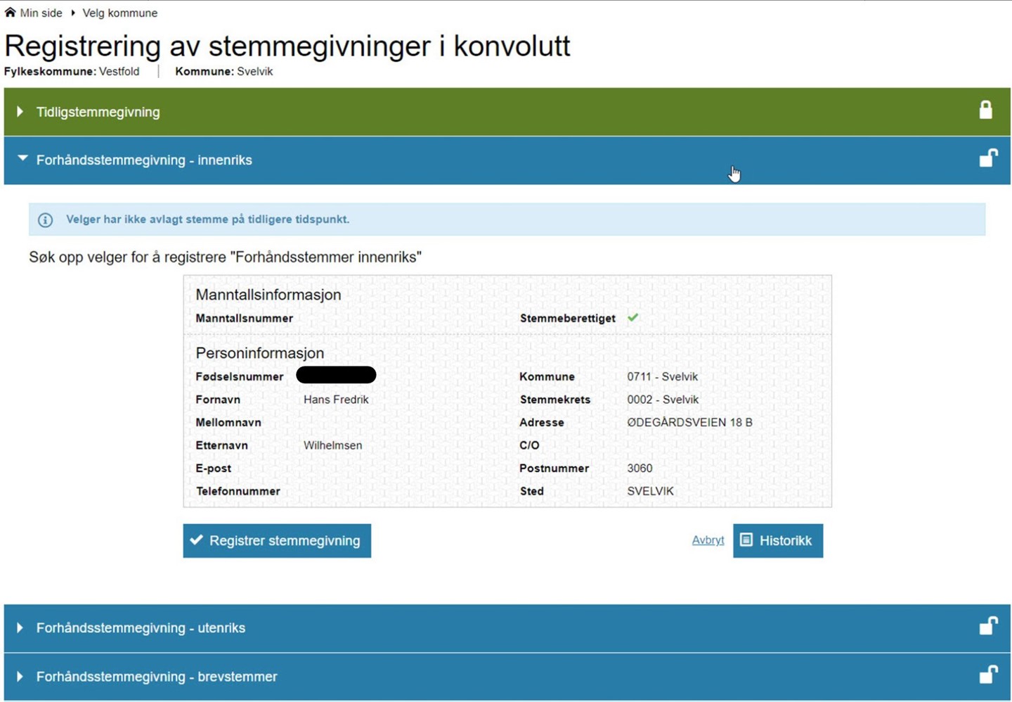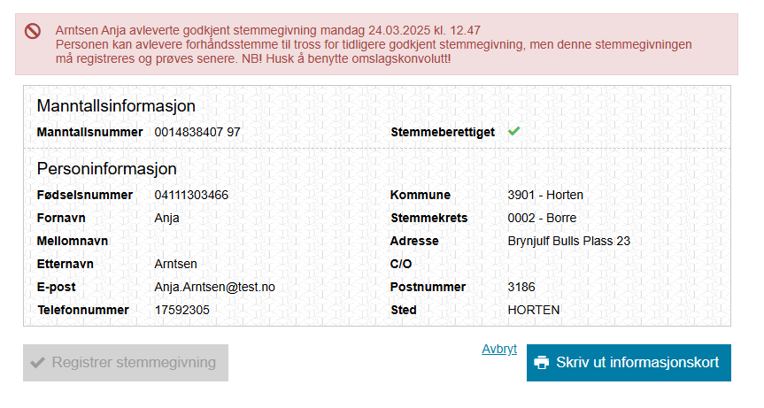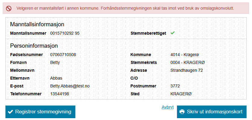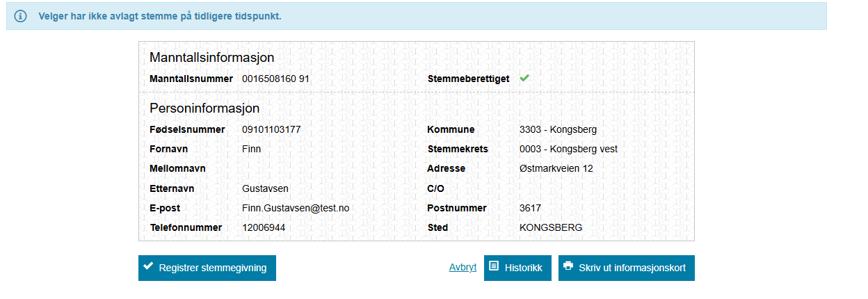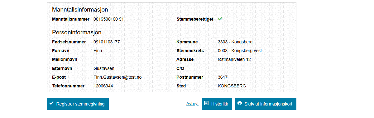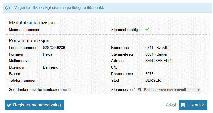 Når dere benytter fødselsnummer, skal velgerens informasjon komme opp på skjermen med alle relevante opplysninger dersom velgeren finnes i manntallet.