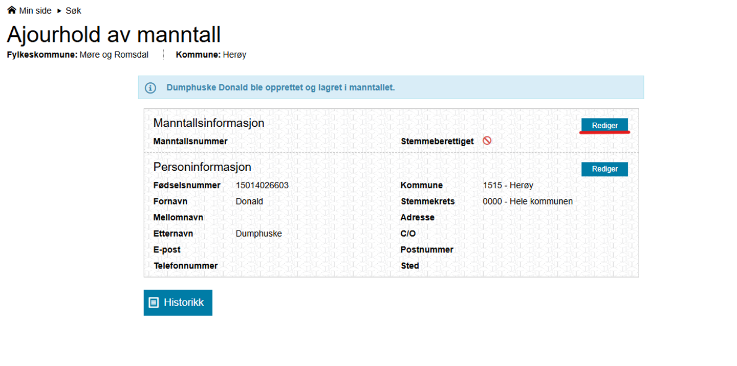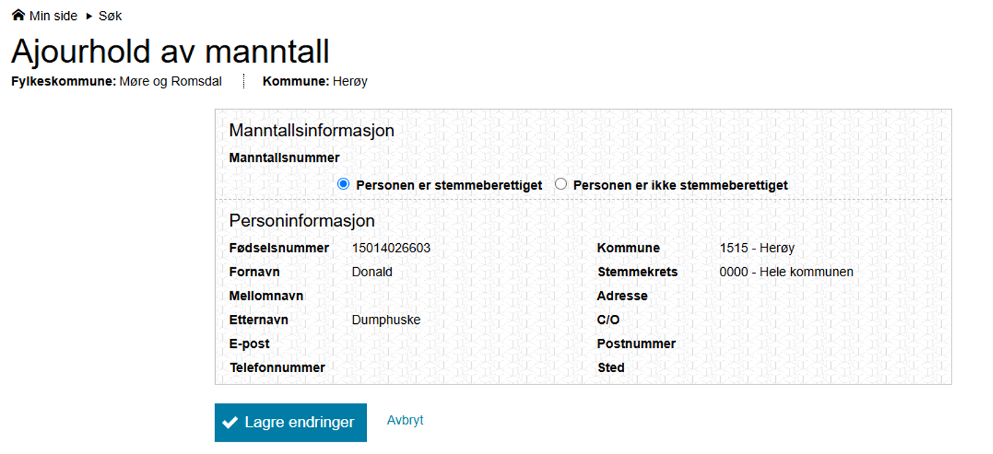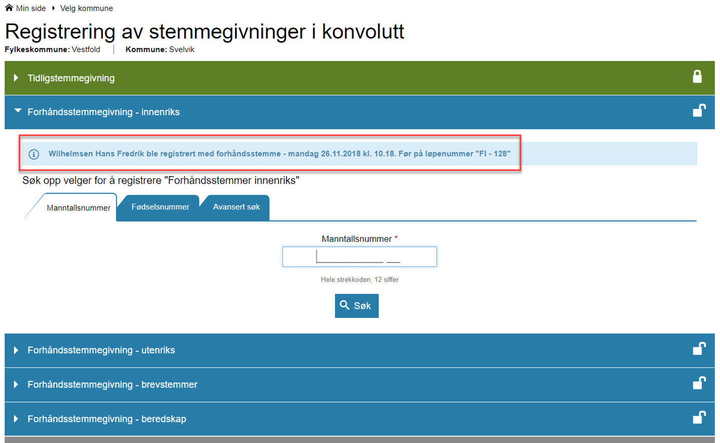 Når dere benytter fødselsnummer, skal velgerens informasjon komme opp på skjermen med alle relevante opplysninger dersom velgeren finnes i manntallet.