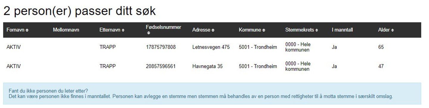 Søkeresultatet vises med følgende persondata: navn, adresse, fødselsnummer, kommune, stemmekrets, alder.
