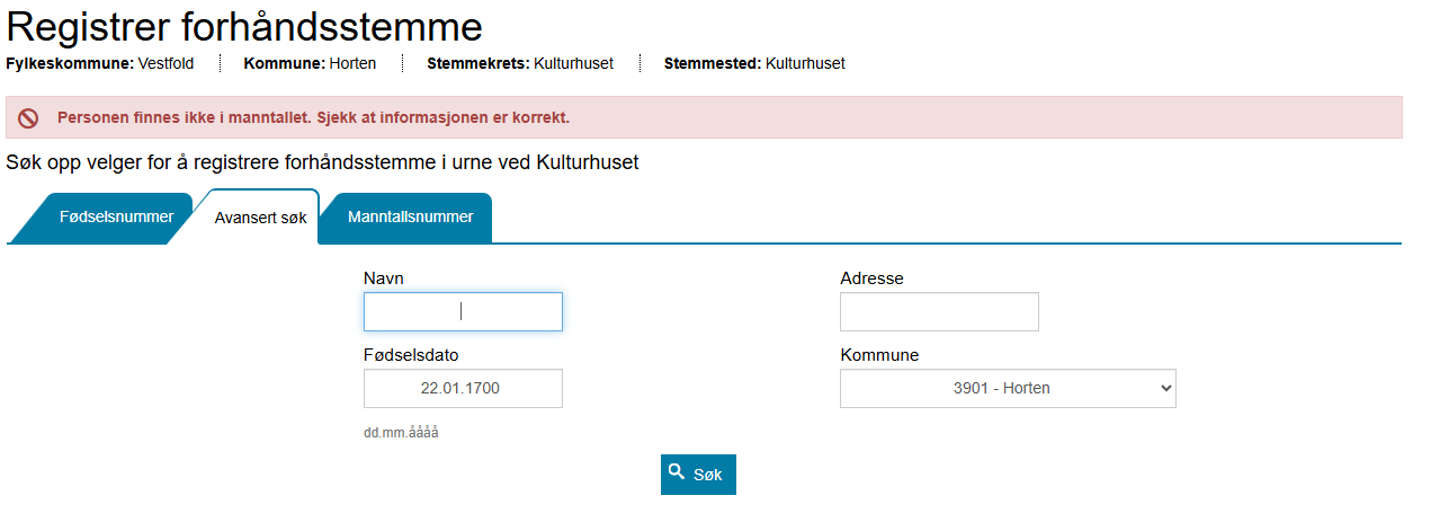 Merk! En velger som ikke finnes i manntallet vil heller ikke ha fått tilsendt informasjon til velger. Hvis velgeren har mottatt brevet og forhåndsstemmemottaker fortsatt ikke finner velgeren i manntallet, bør søket gjøres på nytt.