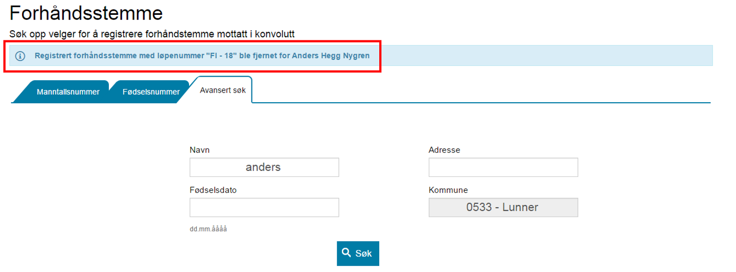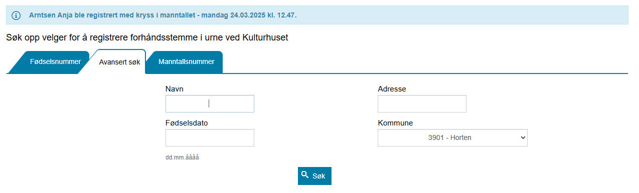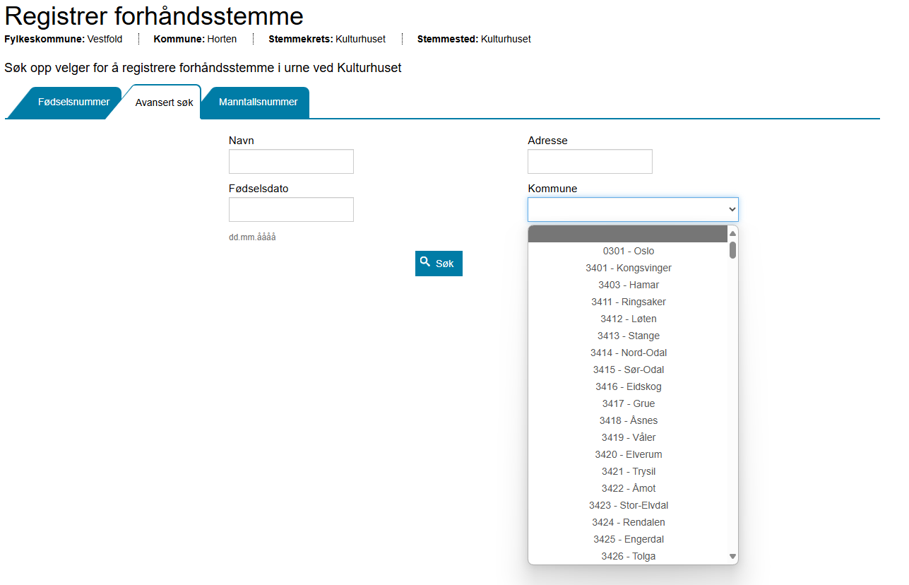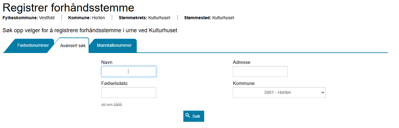 Registrer forhåndsstemme - Søk etter velger - Avansert søk