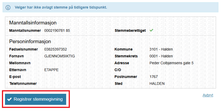 Ved å klikke på "Registrer stemmegivning" blir det satt et kryss i det elektroniske manntallet. Dette bekrefter at velgeren har avgitt godkjent stemmegivning.