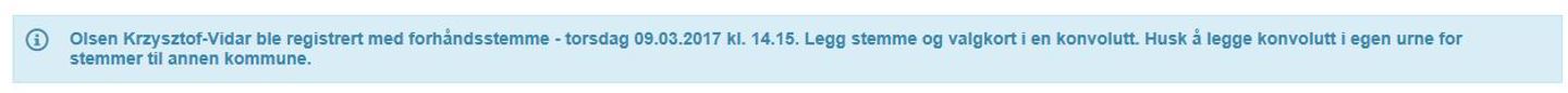 Skjermbildet under viser hvilken tilbakemelding forhåndsstemmemottaker får dersom en velger har avgitt forhåndsstemmegivning tidligere.
