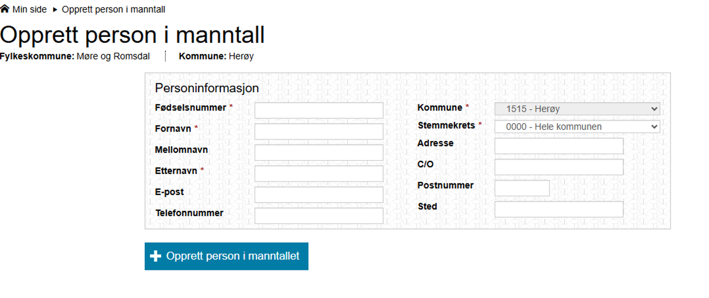 Fyll inn følgende opplysninger om velgeren i feltene og trykk "Opprett person i manntallet".