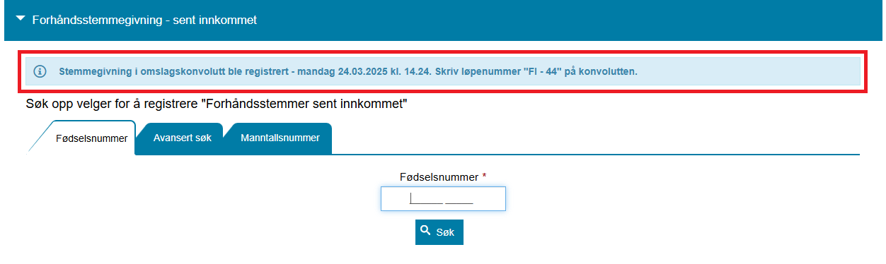 Søk opp velgeren ved å bruke fødselsnummer, avansert søk eller manntallsnummer. Du finner da riktig velger, og kan registrere stemmegivingen. Alle stemmetyper har samme fremgangsmåte i EVA for å søke opp velger og registrere stemmegivningen i konvolutt.