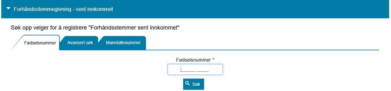 Du kan benytte fanen "Fødselsnummer" for å søke opp velgeren. Ved søk på fødselsnummer skal alle 11 siffer i fødselsnummeret legges inn.
