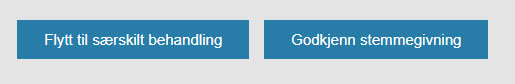 Merk: Det kan være andre forhold knyttet til stemmegivningen som gjør at den skal behandles særskilt. Dette er forhold ved stemmegivningen som du må kontrollere manuelt utenfor systemet, for eksempel at stemmegivningen ikke er avgitt til rett tid, eller at omslagskonvolutten er åpen eller forsøkt åpnet. I slike tilfeller skal stemmegivningen flyttes fra ordinær til særskilt behandling.