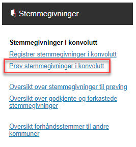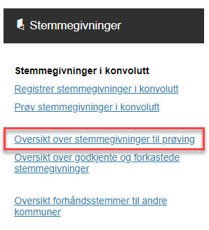 I EVA finner du en oversikt over alle stemmegivninger i konvolutt som ligger til prøving. Oversikten er i menypunkt et "Oversikt over stemmegivninger til prøving".