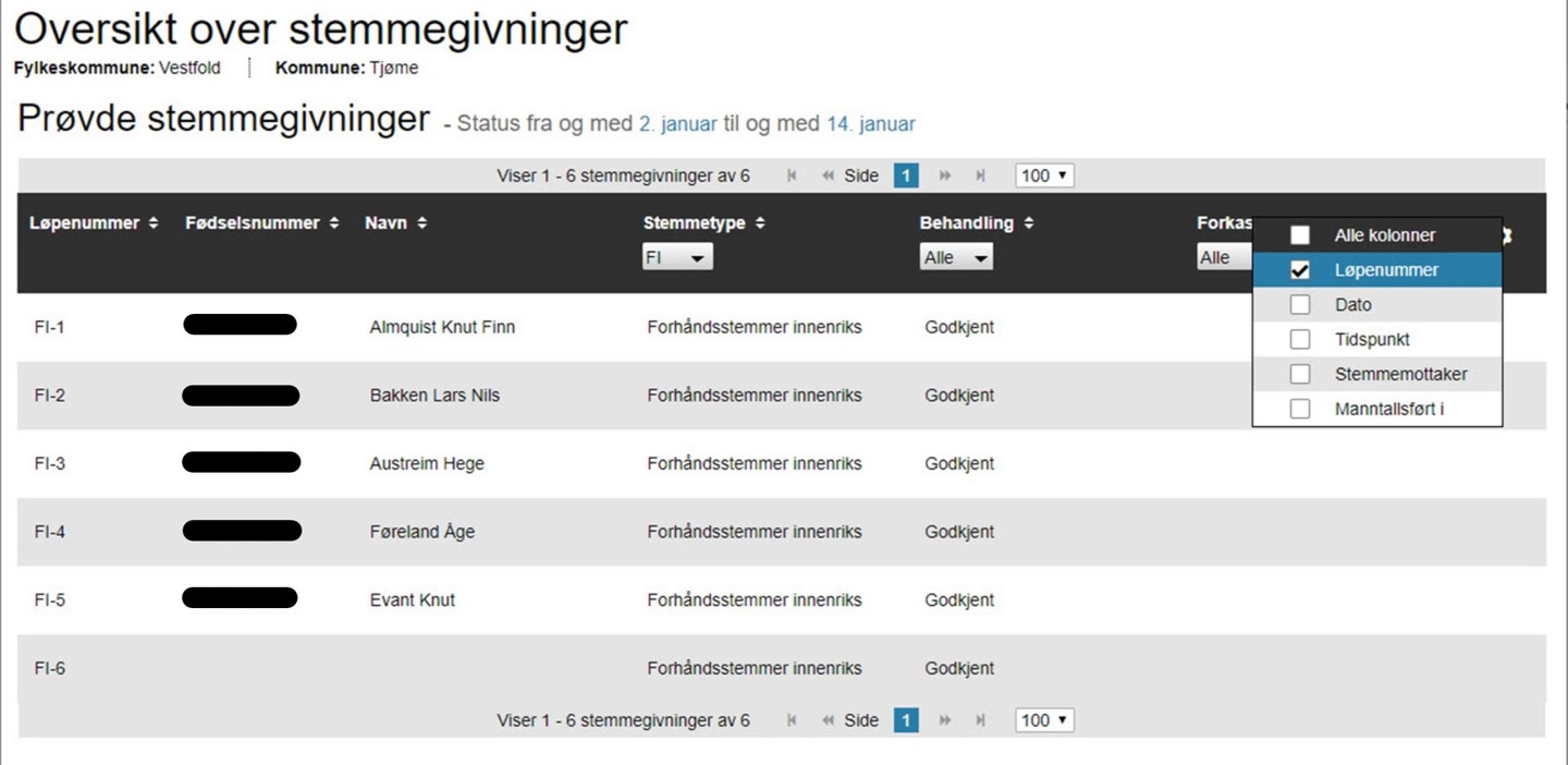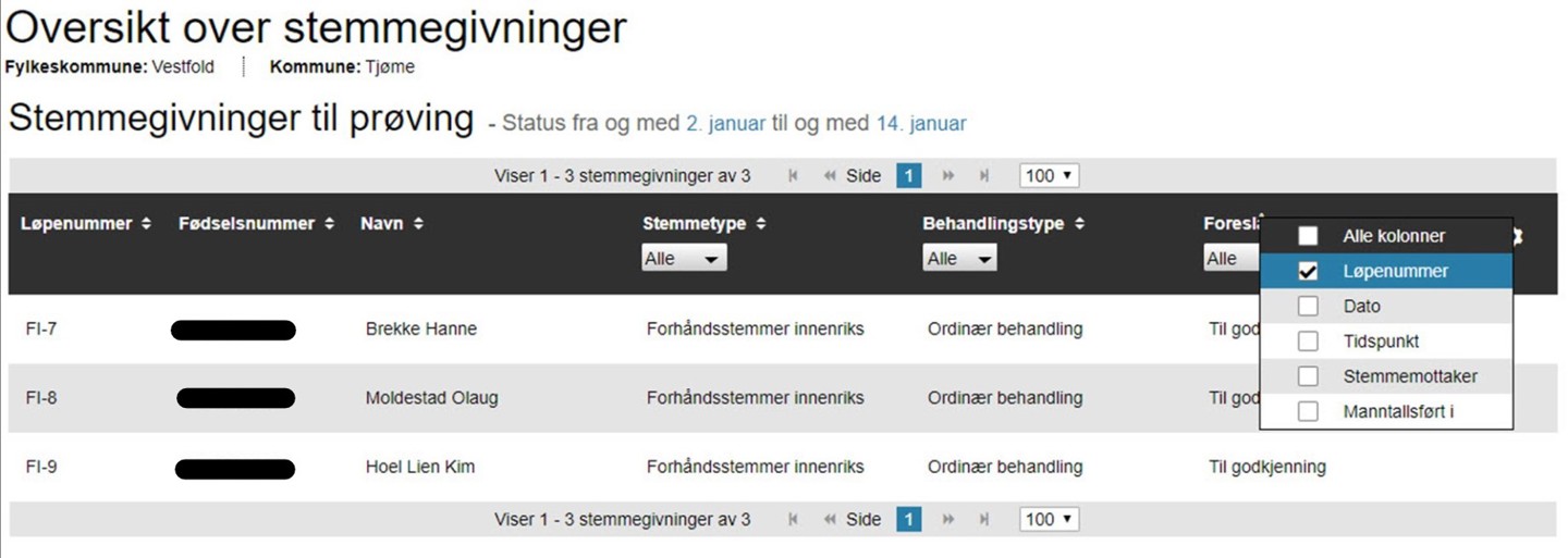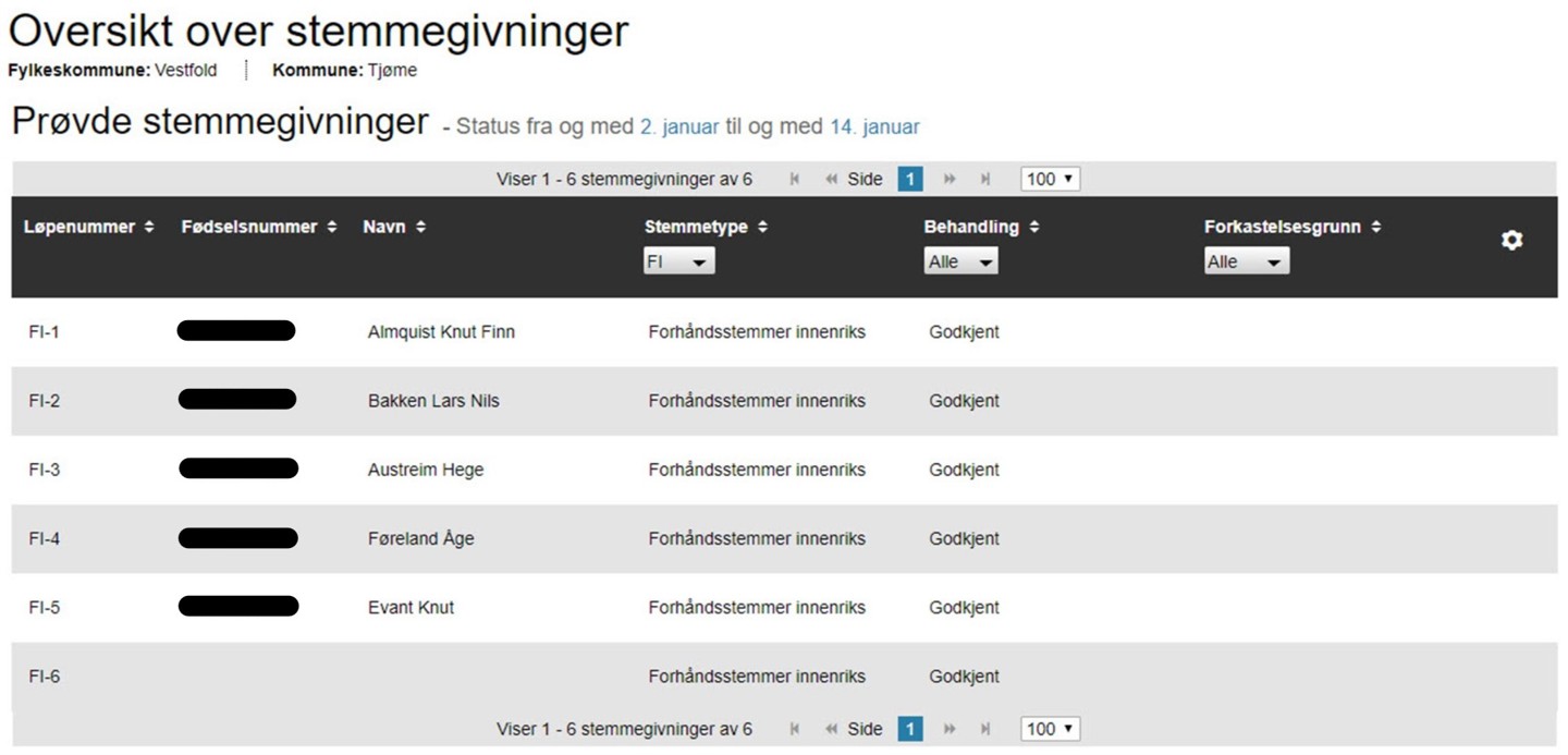 For eksempel; om du går inn i oversikten fra konvoluttkategorien "Forhåndsstemmegivning - innenriks" og velger "Godkjente", vil du i oversikten få filtrert og sortert alle stemmegivninger som er markert med konvoluttkategorien "Forhåndsstemmegivning - innenriks" som er godkjent ved prøving i tidsrommet fra 10. august til og med fredag før valgdagen.