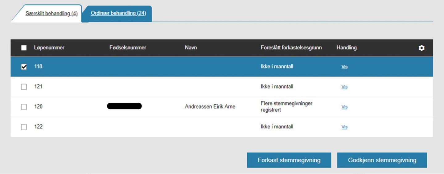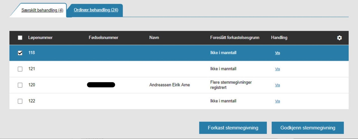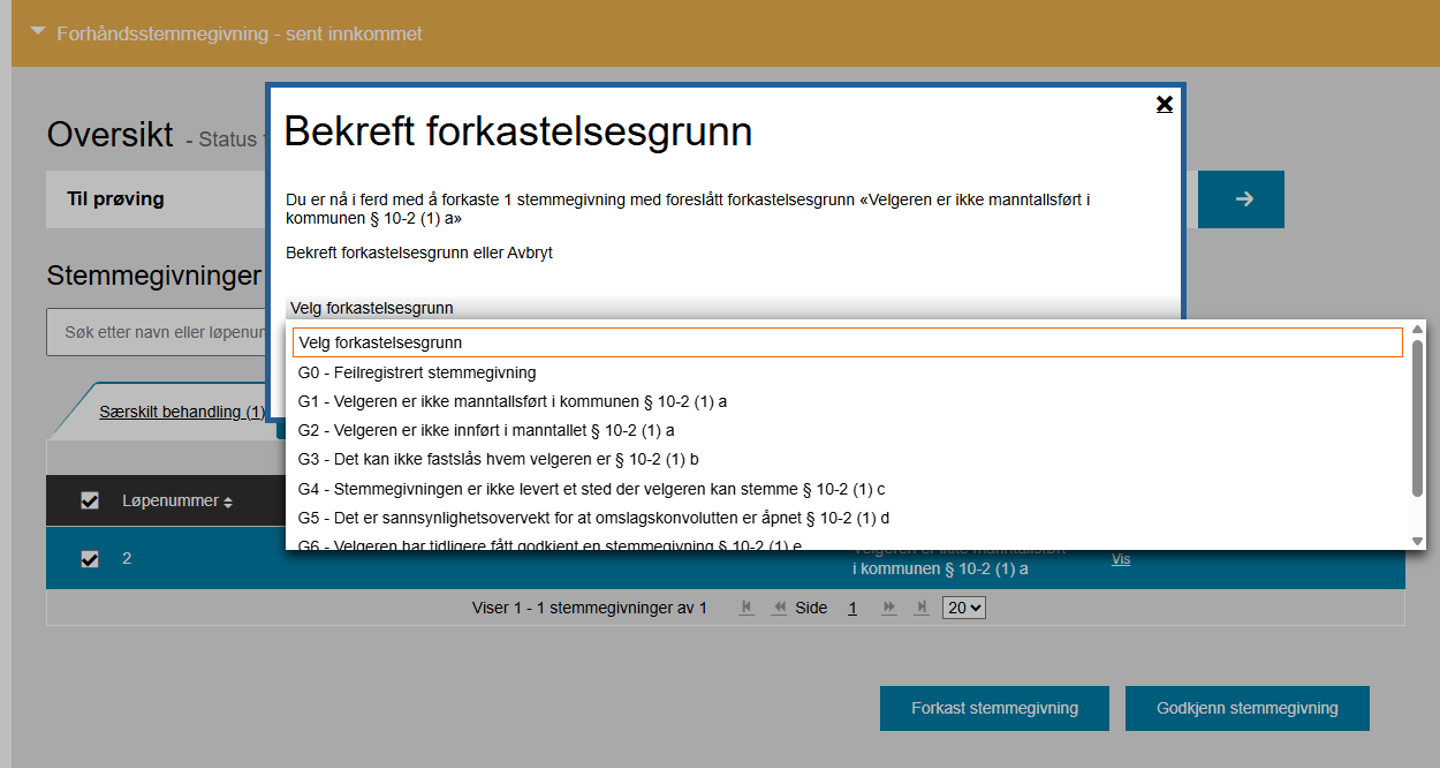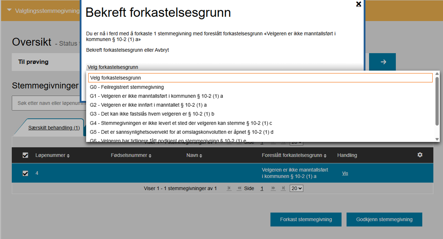 Stemmegivninger som skal behandles særskilt kan enten forkastes eller godkjennes. Hvis du forkaster en særskilt stemmegivning, bekrefter du en foreslått forkastelsesgrunn. Ved å godkjenne blir stemmegivningen godkjent, og det settes et elektronisk kryss i manntallet ved vedkommende velger. Stemmegivningen er da klar til opptelling.