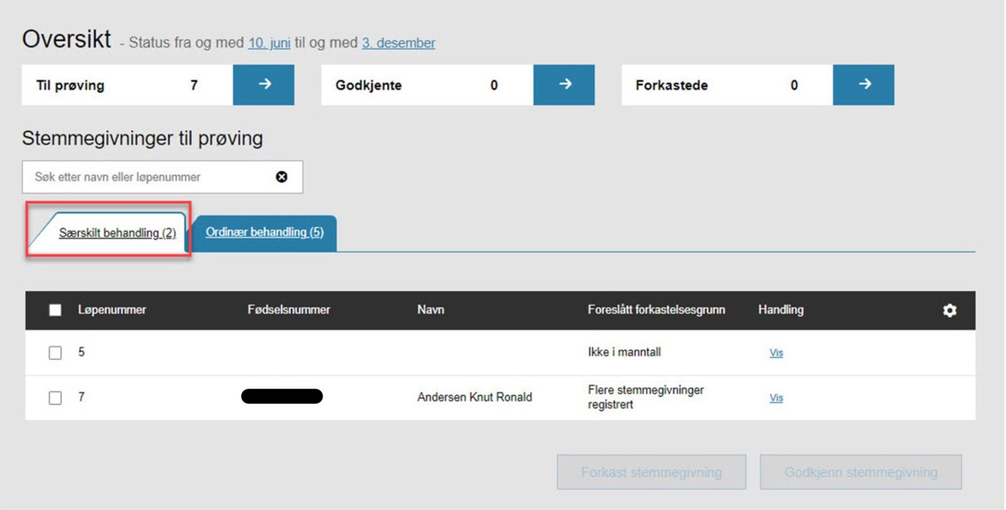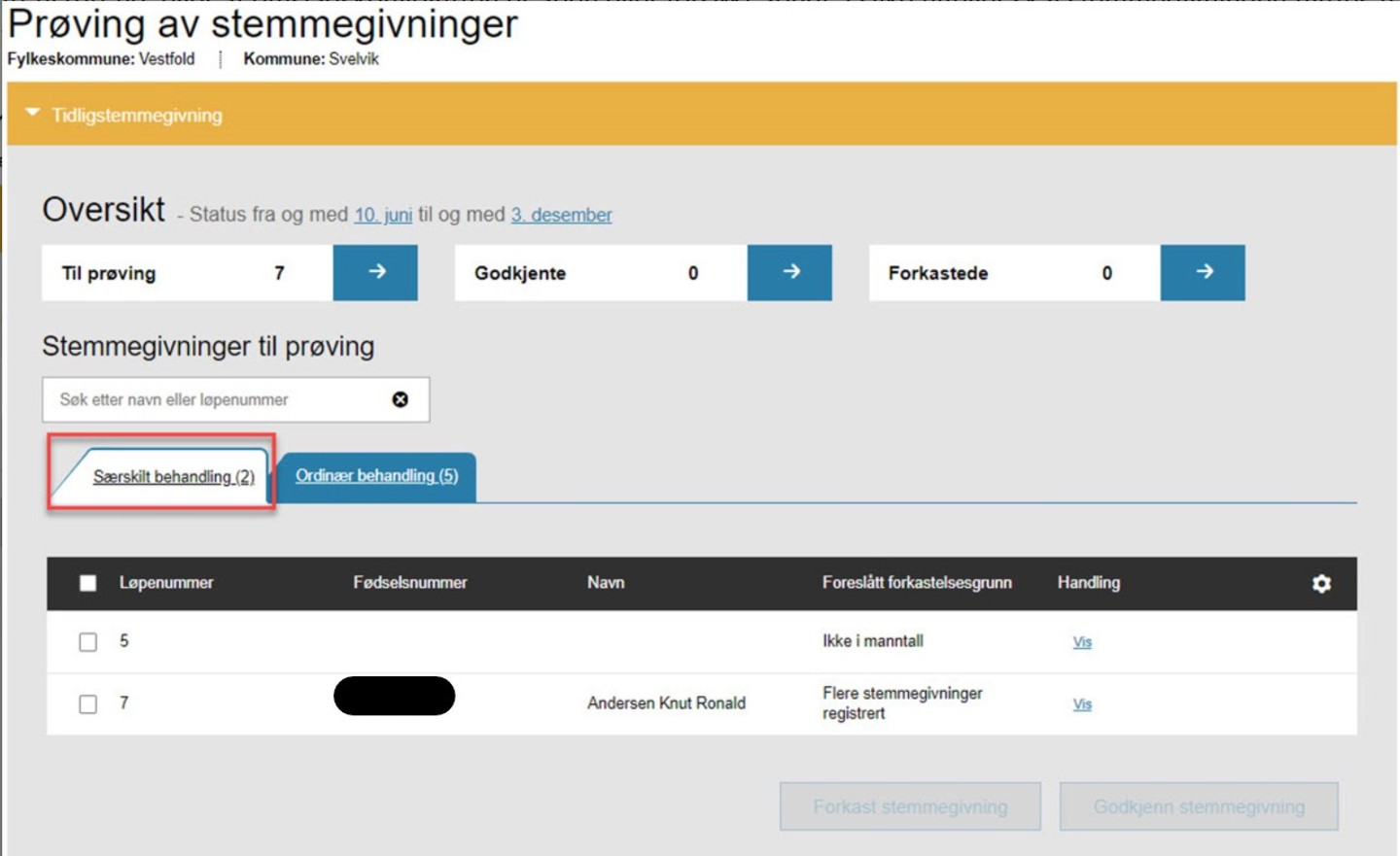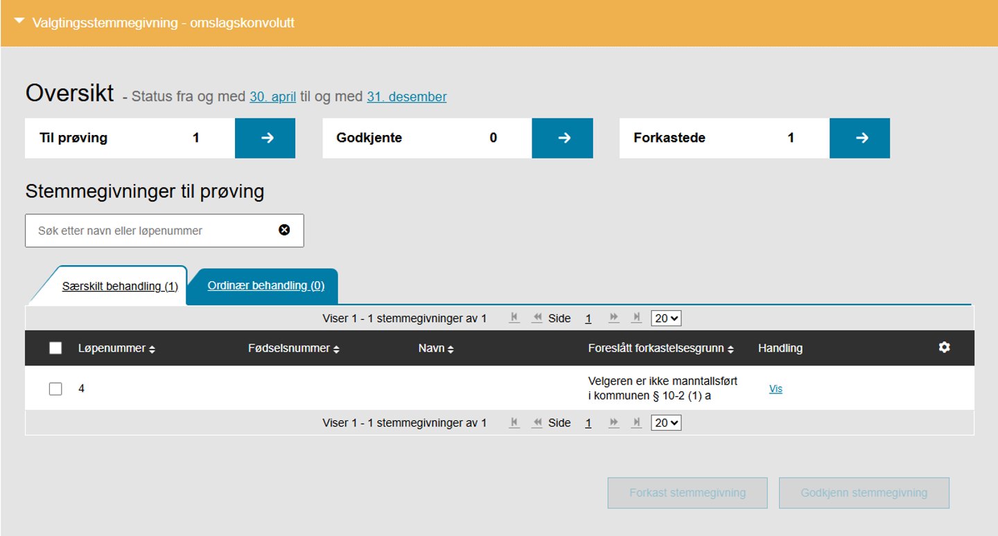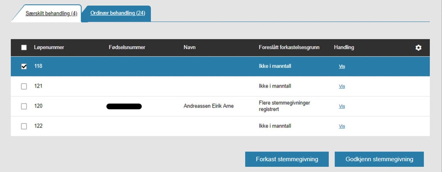 Stemmegivninger som skal behandles særskilt kan enten forkastes eller godkjennes. Hvis du forkaster en særskilt stemmegivning, bekrefter du en foreslått forkastelsesgrunn. Ved å godkjenne blir stemmegivningen godkjent, og det settes et elektronisk kryss i manntallet ved vedkommende velger. Stemmegivningen er da klar til opptelling.
