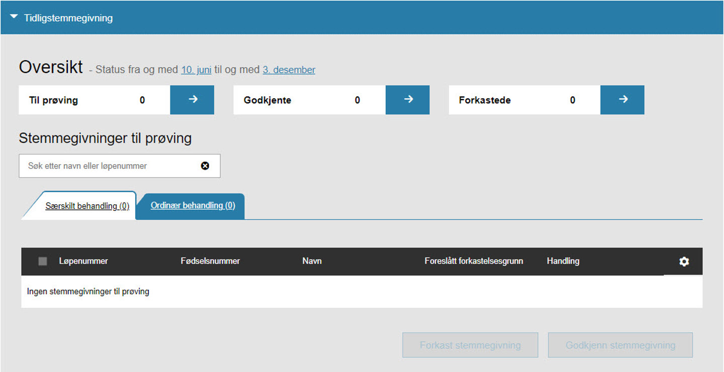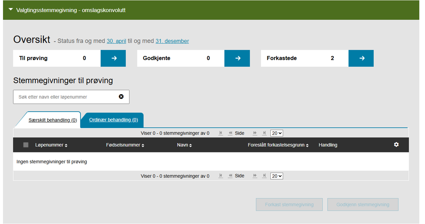 Den øverste oversikten viser til antallet stemmegivninger som ligger til prøving innenfor konvoluttkategori, samt hvor mange av allerede behandlede stemmegivninger som er godkjent eller forkastet. Dette hjelper deg med å holde kontinuerlig oversikt over stemmegivninger som ligger til prøving og stemmegivninger som er ferdig behandlet.